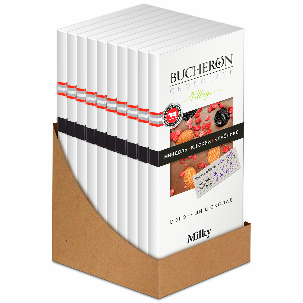 Отборные какао-бобы с Берега Слоновой Кости позволили создать молочный шоколад с нежным сливочным вкусом. Его мягкость гармонично сочетается со вкусом калифорнийского миндаля, чилийской клюквы и итальянской клубники.
