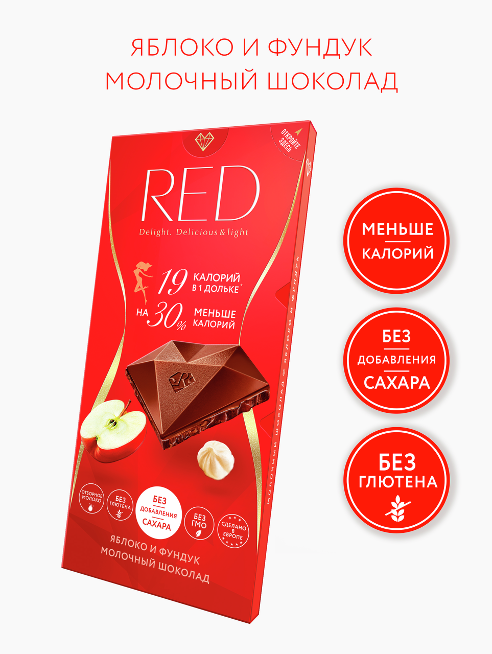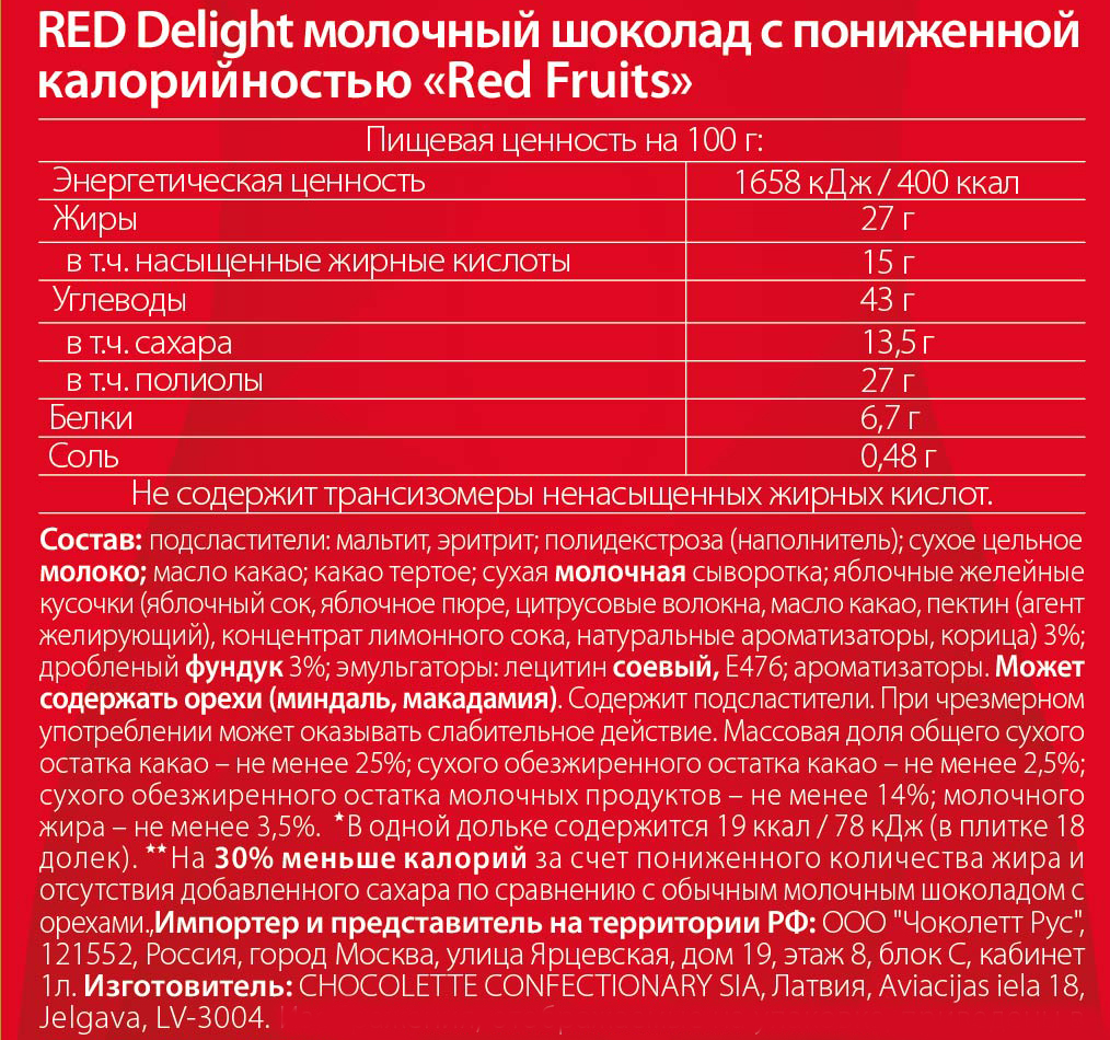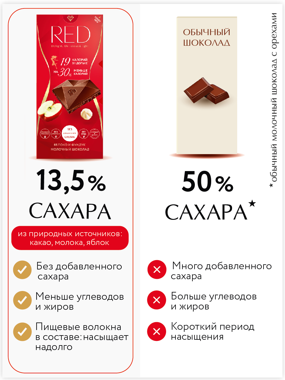 Полезные и здоровые сладости! Red - легкий и вкусный шоколад без сахара. Какао-бобы из Кот-д’Ивуара и отборное молоко придают нашему шоколаду восхитительный сливочный вкус и нежную текстуру. Дополнительные оттенки обеспечивают приятная кислинка яблока и хрустящий фундук. А еще Red это: Меньше калорий, чем в аналогичном шоколаде других марок. Приятный вкус: отборное какао из Cte d’Ivoire и особая рецептура, благодаря которым вкус шоколада Red так ценят потребители. Red - как часть спортивного питания: в одной дольке шоколада Red всего 19 ккал - как в одной дольке яблока, он сладкий, но без сахара - идеально для читмила (планового нарушения диеты).