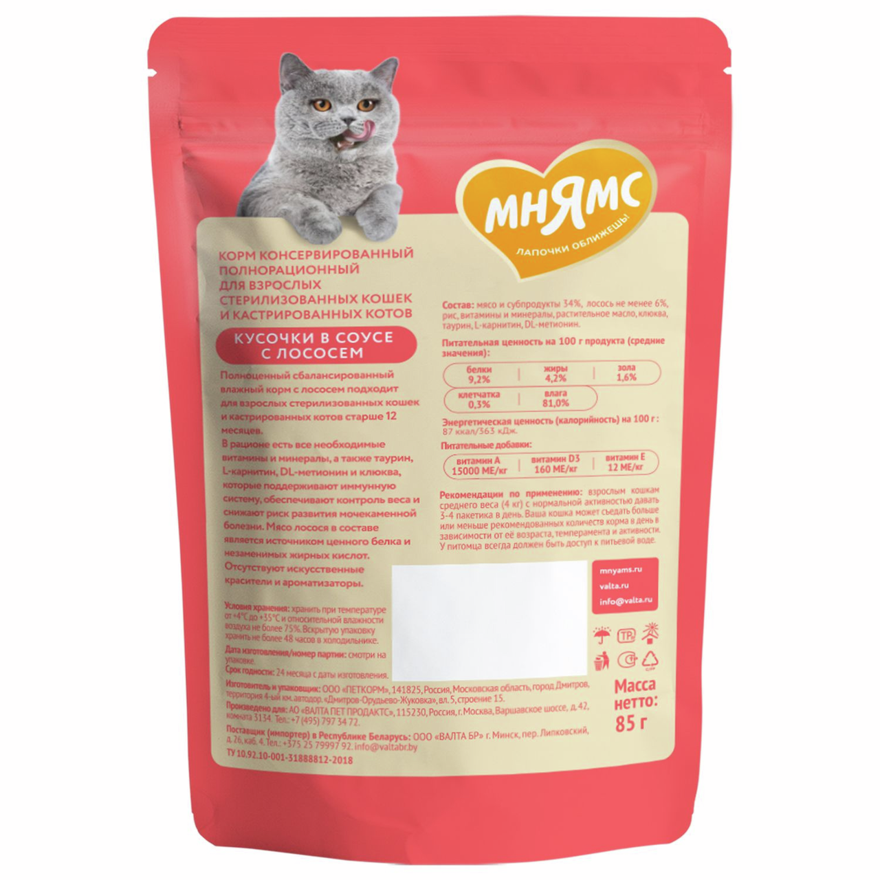 Высококачественный полнорационный сбалансированный влажный корм с лососем подходит для взрослых стерилизованных кошек и кастрированных котов старше 12 месяцев. Высококачественный полнорационный сбалансированный влажный корм с лососем подходит для взрослых стерилизованных кошек и кастрированных котов старше 12 месяцев. В рационе есть все необходимые витамины и минералы, а также таурин, L-карнитин, DL-метионин и клюква, которые поддерживают иммунную систему, обеспечивают контроль веса и снижают риск развития мочекаменной болезни. Мясо лосося в составе является источником ценного белка и незаменимых жирных кислот. Отсутствуют искусственные красители и ароматизаторы. Корм Мнямс реализуется в удобной упаковке весом 85 г. Разработан с учетом физиологических потребностей питомцев. Содержит в своем составе компоненты: мясо и субпродукты 34%, лосось не менее 6%, рис, витамины и минералы, растительное масло, клюква, таурин, L-карнитин, DL-метионин.