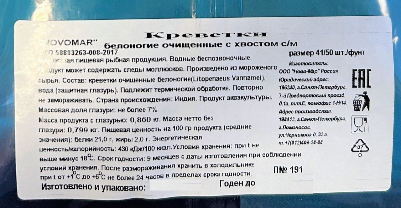 Креветка очищенная белоногая, вода (защитная глазурь).