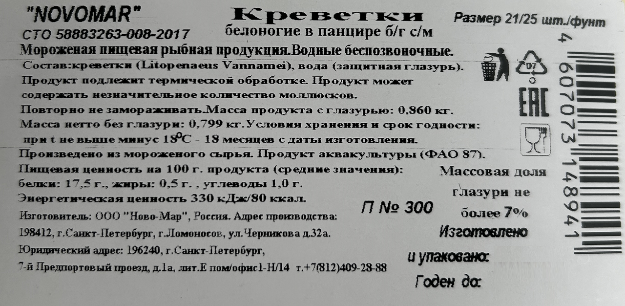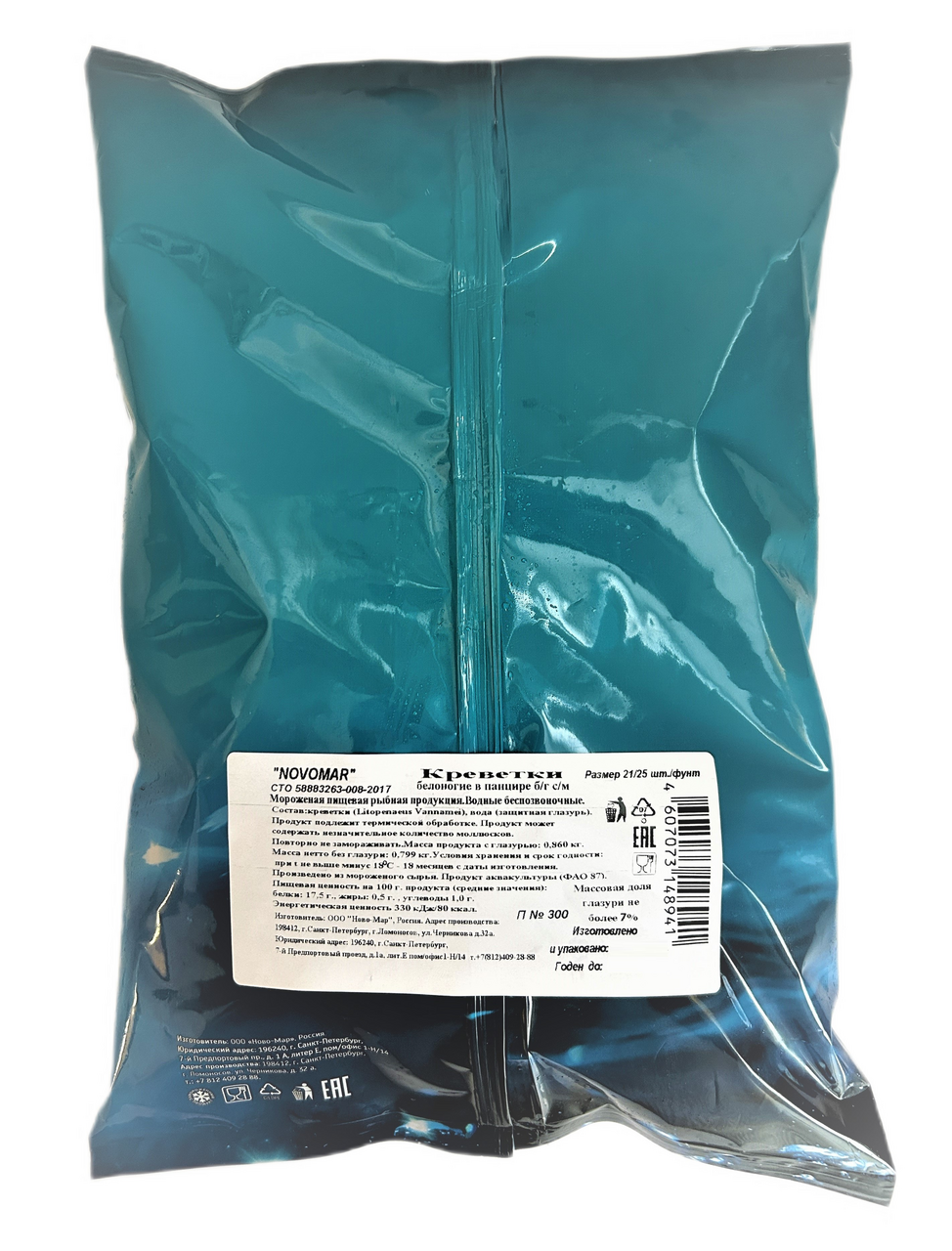 Креветки Novomar белоногие без головы свежемороженые 21/25, 860г