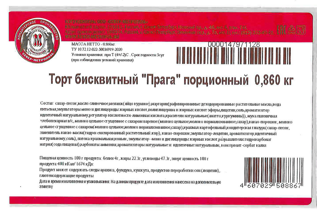 Торт Прага Метрополь бисквитный порционный, 860г