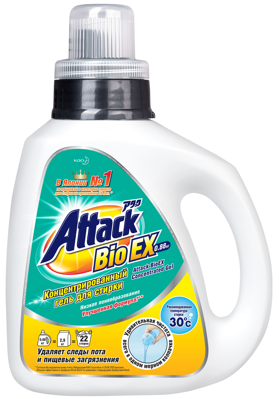 Attack BioEX Концентрированный универсальный гель для стирки 0,88 кг. Для стирки белого, цветного, темного и черного белья (хлопок, лен, синтетика), для всей семьи. Безупречно отстирывает в холодной воде, что позволяет носить любимые вещи дольше, снизить время стирки и расход электроэнергии. Проникает глубоко в волокно и вымывает въевшуюся грязь, засаленность и неприятные запахи. Предотвращает тусклость ткани, не оставляет белых разводов. Биоразлагаемый (после стирки ПАВ и энзимы распадаются без ущерба для окружающей среды), не содержит фосфатов и хлора, легкий и прохладный аромат. Срок годности 36 месяцев при температуре -20+30.