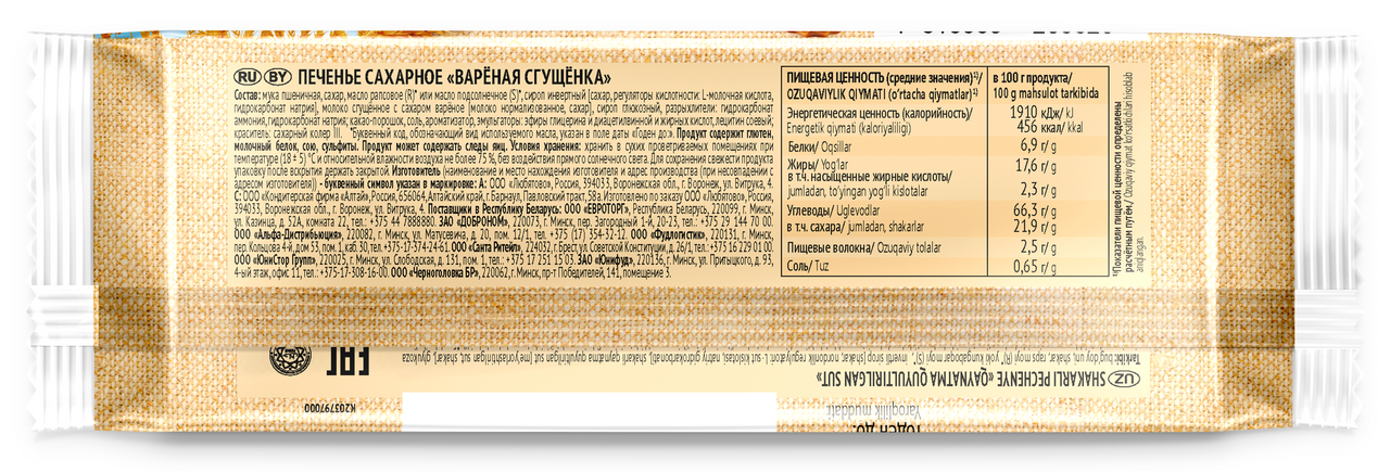 С натуральным варёным сгущённым молоком; удобно взять, вкусно съесть; обновили форму печенья, сохранили традиции. Насыщенный вкус натуральной вареной сгущёнки в составе печенья вернёт вас в счастливое и беззаботное детство, а приятная хрустящая текстура будет отличным дополнением семейному чаепитию.