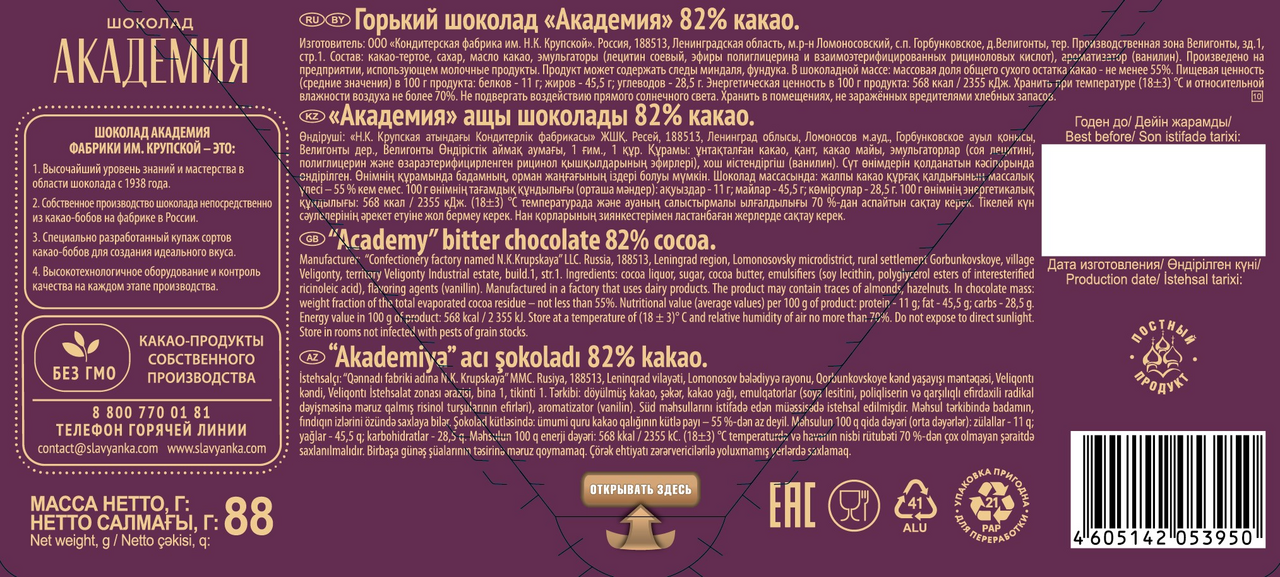 Шоколад Кондитерская фабрика Крупской горький Академия 82% какао, 88г