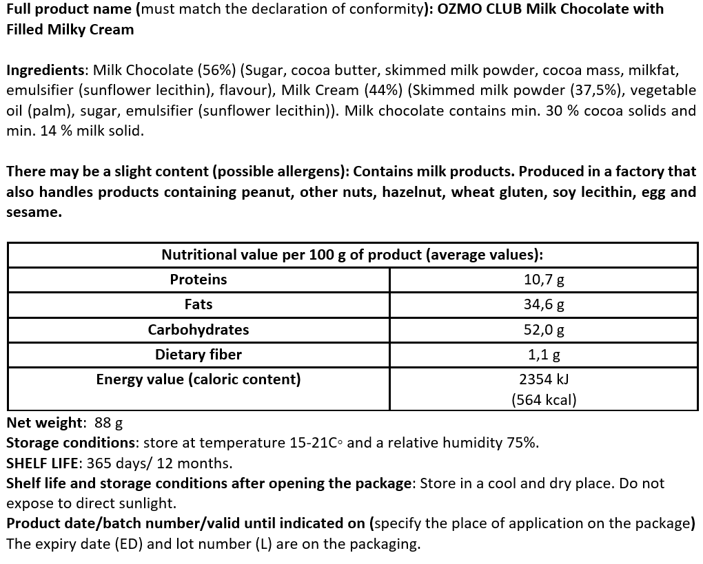 Шоколад Ozmo Club с молочной начинкой, 88г