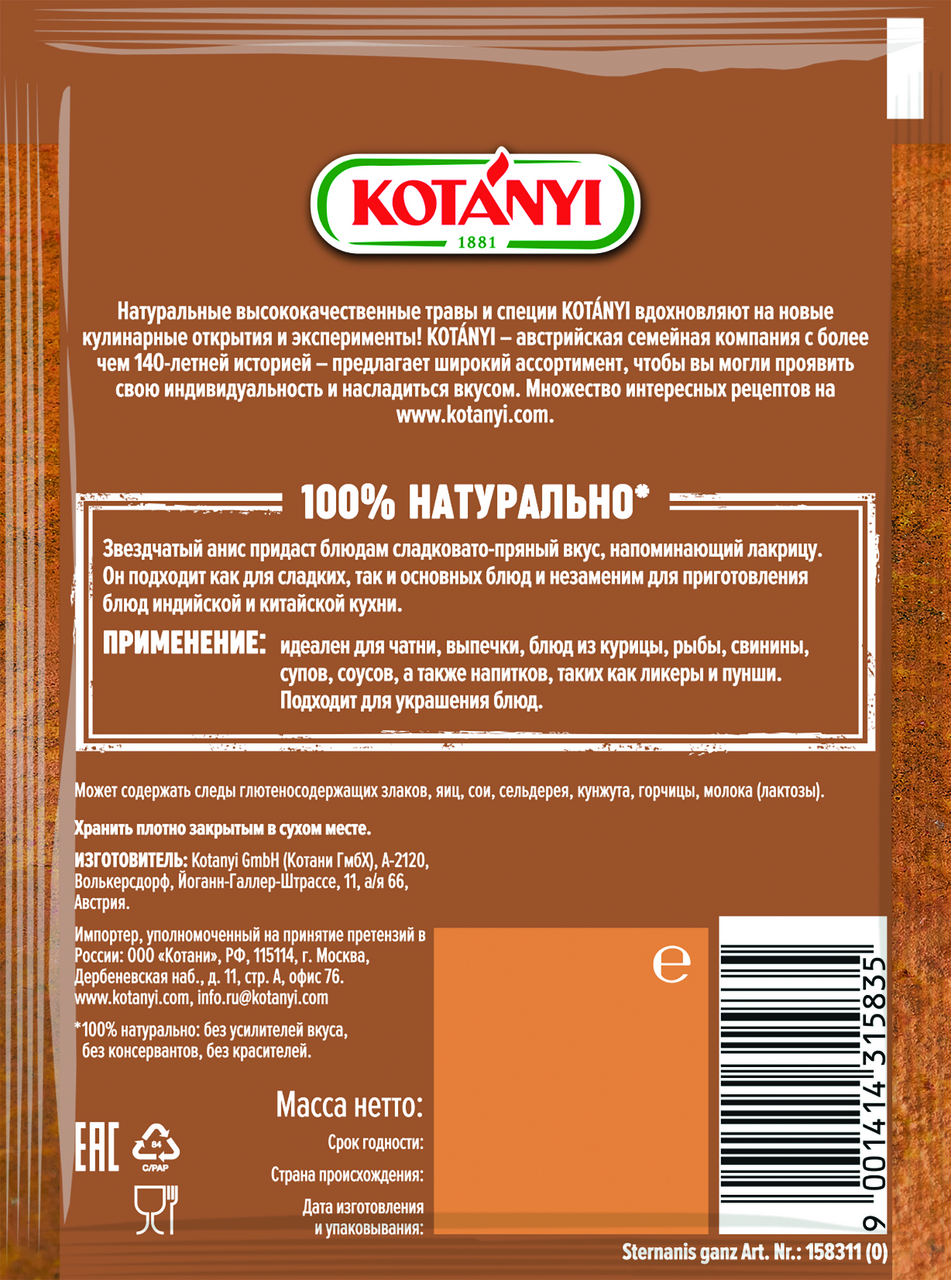 Анис Kotanyi звездчатый бадьян целый Kotanyi, 8г – специфическая пряность, обладающая неповторимым ароматом и придающая блюдам необычный вкус. Приправа содержит большое количество эфирных масел, используется как в кулинарии, так и в косметологии. Пряность применяют для приготовления выпечки и десертов, с особой осторожностью кладут в рыбные блюда. Нередко добавляют в консервацию. Из самых популярных продуктов, в которые добавляется анис можно перечислить: конфеты, рыба, морепродукты, заливные мясные и рыбные блюда, хлеб, горячие напитки, выпечка, овсяная и рисовая каши, сметанный соус, карри, рыбный, молочный и овощной супы. Отлично работает в сочетании с кардамоном, гвоздикой, перцем, корицей. К примеру, для приготовления анисового чая, полезного для укрепления иммунитета и лечения респираторных заболеваний, нужно на 1 литр кипящей воды добавить 5 г аниса, дать настояться, процедить и пить, как обычный чай с сахаром, лимоном, вареньем, медом.