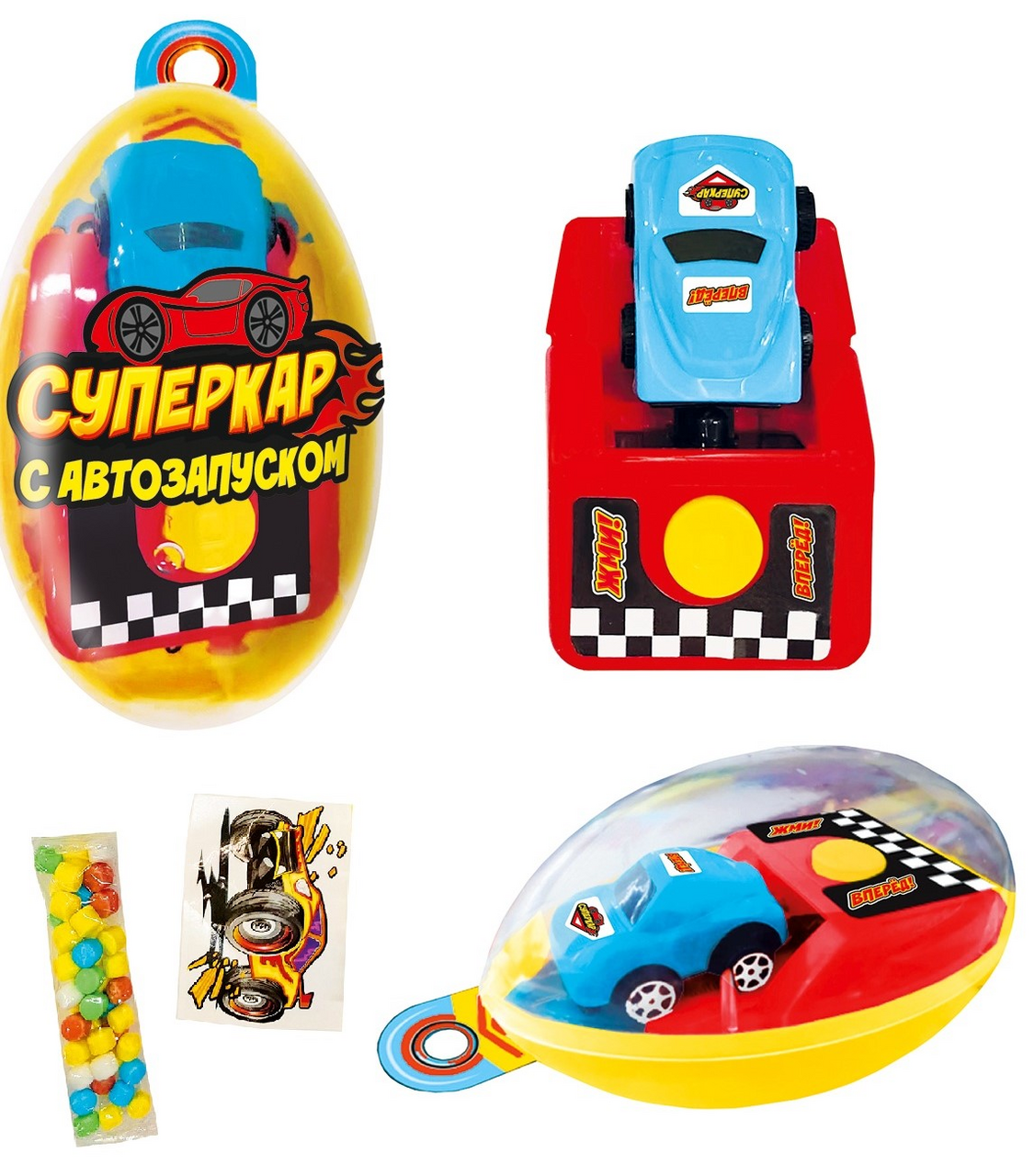 Драже Конфитой с игрушкой суперкар, 8г x 12 шт - мини-машинка с устройством автозапуска, классная тату и вкусные конфетки драже в яйце. Собери свою коллекцию суперкаров и крутых татушек с гоночными авто.