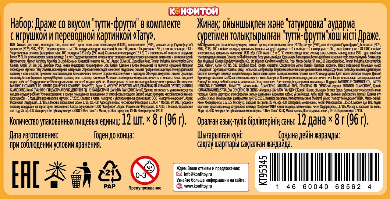 Декстроза, сахар, патока, загуститель (Е1400), агент антислеживающий (Е470), регулятор кислотности (Е330), ароматизатор (клубника), красители (Е102, Е110, Е129, Е133).