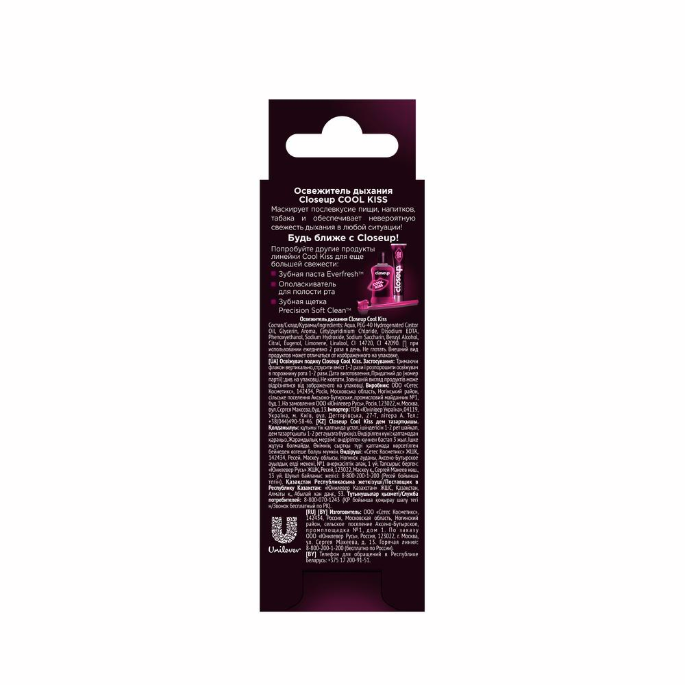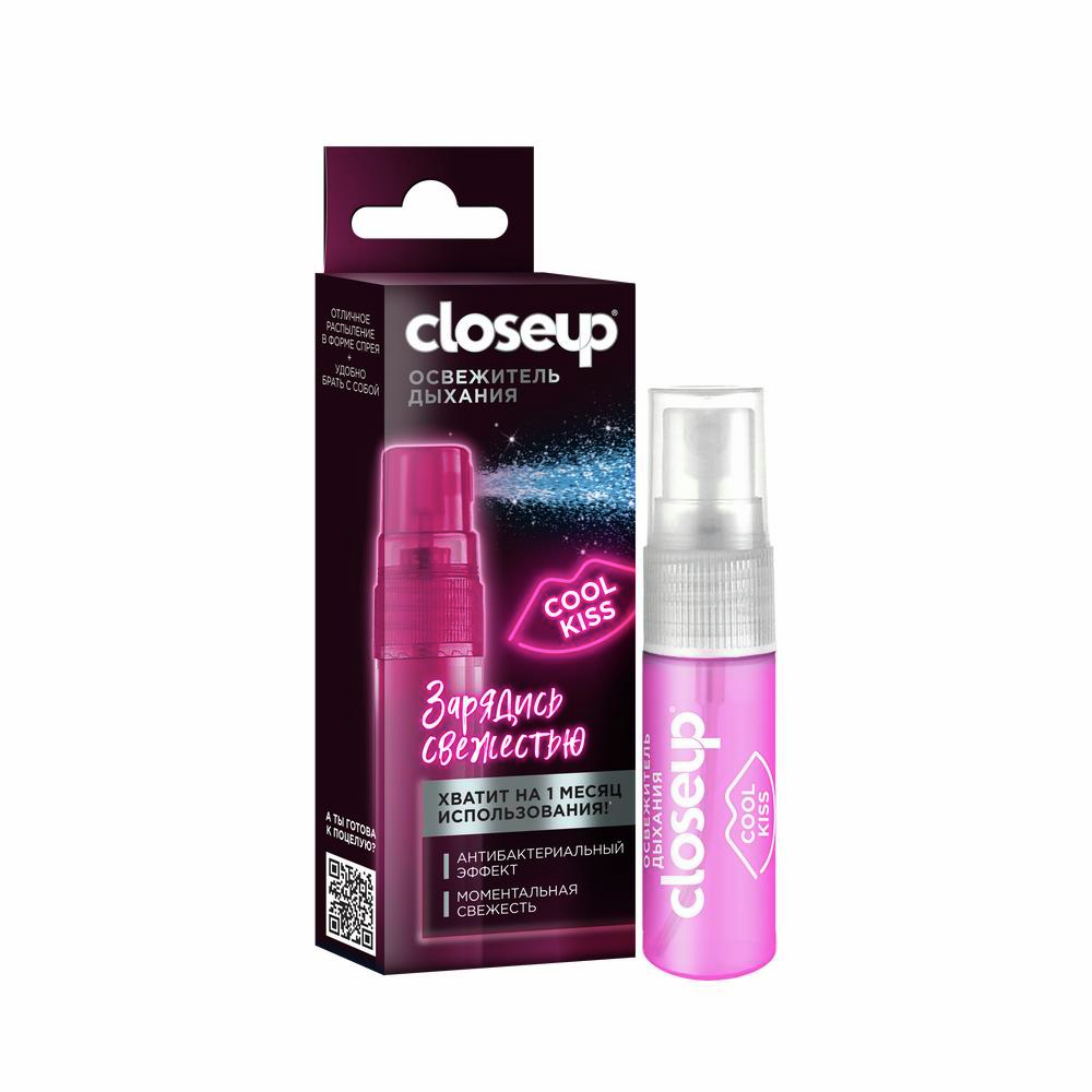 "Антибактериальная формула нового освежителя дыхания Closeup COOL Kiss отлично освежает и устраняет до 99% бактерий*! Почувствуйте невероятную свежесть!Одного флакона освежителя дыхания Closeup COOL Kiss хватит на месяц использования**.Освежитель дыхания Closeup COOL Kiss обеспечивает моментальный заряд свежести в любой ситуации, маскируя послевкусие пищи, напитков, табака.Освежитель дыхания Closeup COOL Kiss обладает ярким освежающим вкусом,при этом вкус достаточно мягкий и не обжигает полость рта.Освежитель дыхания Closeup COOL Kiss в форме спрея с антибактериальным эффектом*** отлично распылятся по полости рта, обеспечивая ее защитой от бактерий.Удобный флакон Освежителя дыхания Closeup COOL Kiss можно легко брать с собой в поездки.Освежитель дыхания Closeup COOL Kiss обеспечивает освежающий эффект, чтобы в моменты близости вы всегда чувствовали себя уверенно!Освежитель дыхания Closeup COOL Kiss обеспечит полость рта невероятной свежестью!Будьте готовы быть ближе с Closeup и ощутить невероятную уверенность в свежести дыхания.Попробуй другие продукты линейки для еще большей свежести: Зубная паста Everfresh, Ополаскиватель для полости рта, Зубная щетка Precision Soft Clean. А ты готов к поцелую?[*] бактерий зубного налета, по результатам in-vitro тестов компании Unilever, Индия, 2020. [**] Одного флакона освежителя хватает минимум на 60 применений. При использовании 2 раза в день, освежителя хватит на 30 дней. [***] в составе содержится антибактериальный компонент – цетилпиридиний хлорид в действующей концентрации 0,05%"