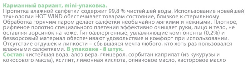 Карманный вариант, mini-упаковка. Пропитка салфеток состоит на 99,8% из сверхочищенной воды и натуральных увлажняющих компонентов (0,2%). Обработка горячим паром делает салфетки необычайно мягкими и нежными. Без липких следов и отдушек, гипоаллергенны. Мягкая текстура салфеток хорошо очищает и увлажняет кожу. Подходит для снятия макияжа. Салфетки удобно использовать на прогулке, в транспорте, в путешествиях и даже дома.