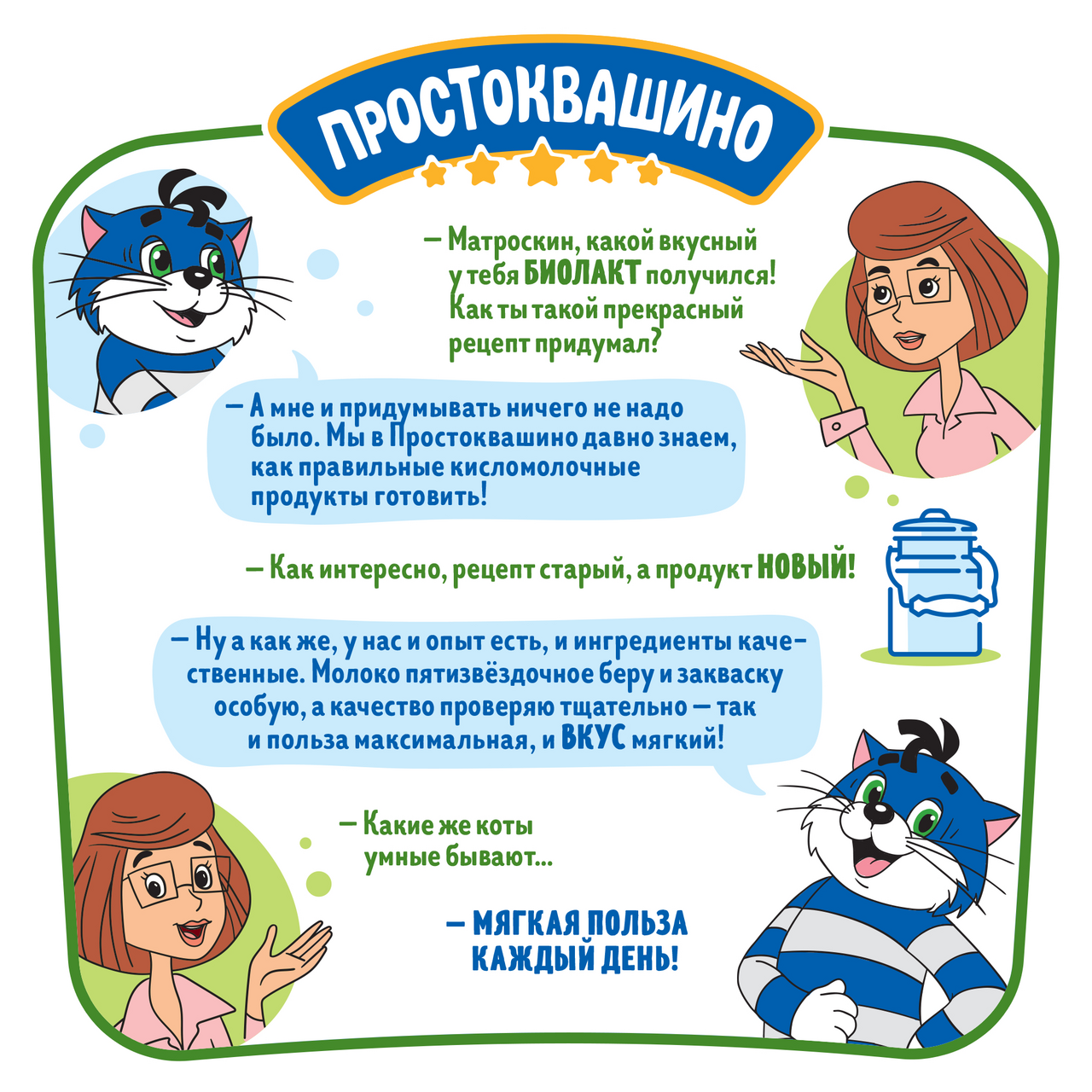 Биолакт Простоквашино - это кисломолочный продукт, приготовленный из высокачественного молока и закваски молочнокислых культур. Имеет мягкий, особенный и приятный вкус. Продукция марки Простоквашино сделана из натурального молока высокого качества, проверяется на наличие антибиотиков, не содержит консервантов и растительных жиров.