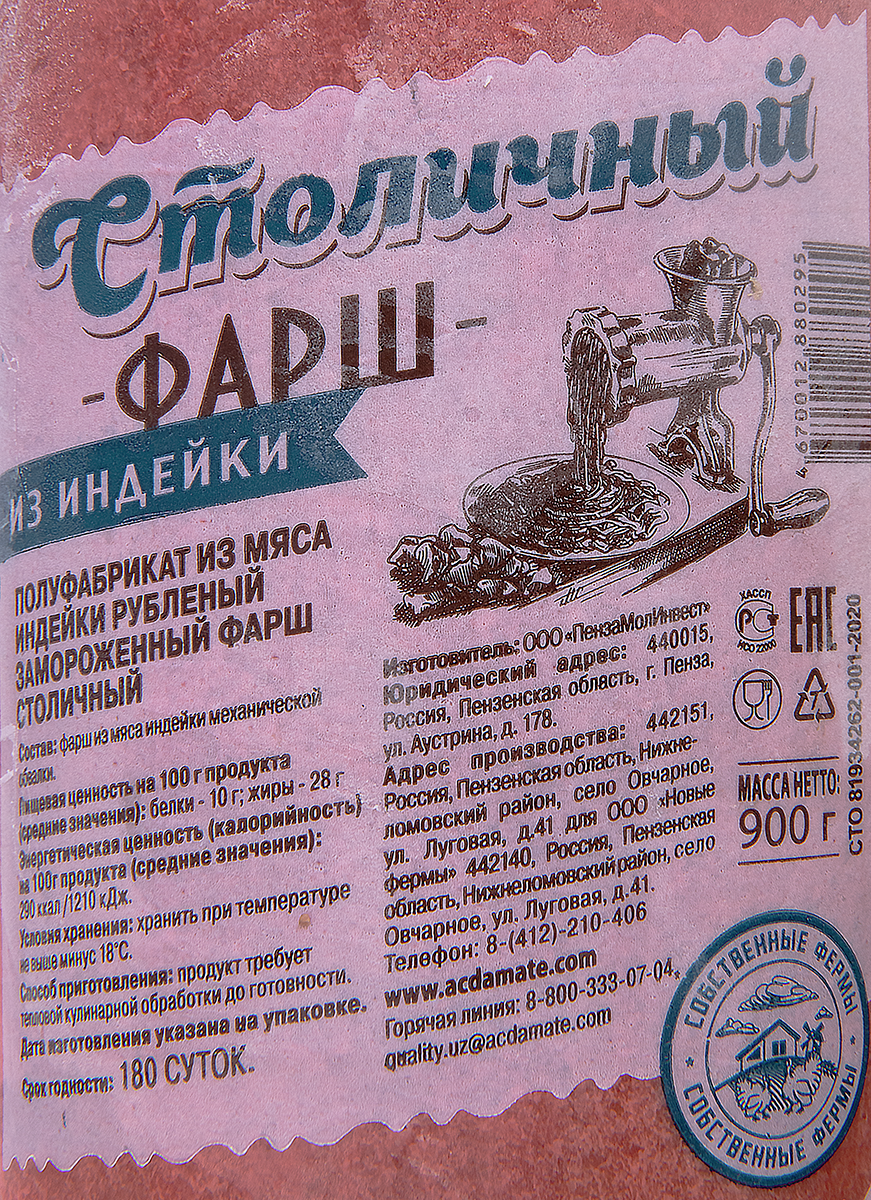 Фарш из индейки Индилайт Столичный замороженный, 900г