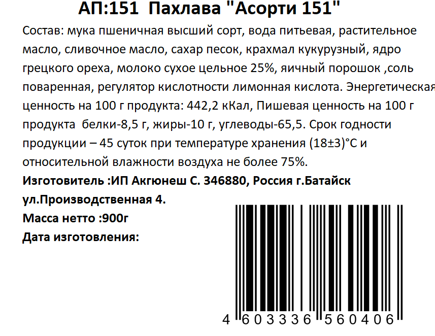Мука пшеничная высший сорт, вода питьевая, растительное масло, сливочное масло, сахар песок, крахмал кукурузный, ядро грецкого ореха, молоко сухое цельное 25%, яичный порошок, соль поваренная, регулятор кислотности лимонная кислота.