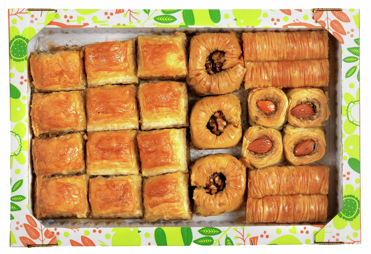 Десерт, присущий кухням восточных стран. Он представляет собой выпечку из тончайшего листового теста с орехами, залитую сладким сиропом. Красивый подарочный набор с восточными сладостями, необычный и полезный презент для детей и взрослых. В наборе турецкая пахлава разных видов.