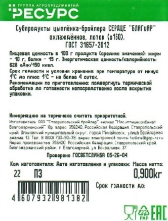 Сердце цыпленка-бройлера Благояр охлажденное, 900г