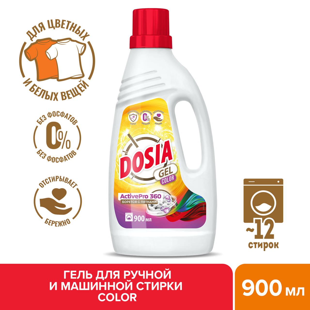 Эффективно и бережно отстирывает различные загрязнения на одежде и белье. Благодаря формуле ActivePro 360 гель придает белью и вещам приятную свежесть и эффективно борется с пятнами. Формула без добавления фосфатов. Гель Dosia Color удаляет пятна даже при температуре 40 градусов, сохраняет цвет вещей и не оставляет разводов. Подходит для цветных, светлых и белых вещей. Используйте Dosia Color в качестве основного средства для стирки. Гель Dosia Color удобен в использовании: дозируйте жидкое средство согласно инструкции, залейте гель в отделение для стирального порошка или добавьте при ручной стирке и замачивании. Для лучшего удаления пятен нанесите гель на пятно перед стиркой.