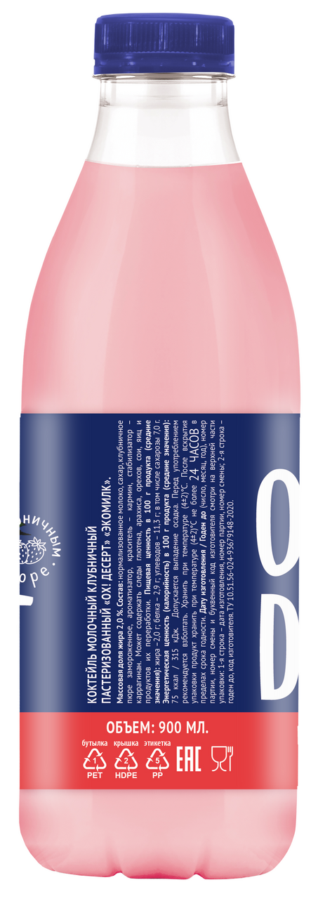 Коктейль молочный Экомилк с клубникой 2%, 900мл