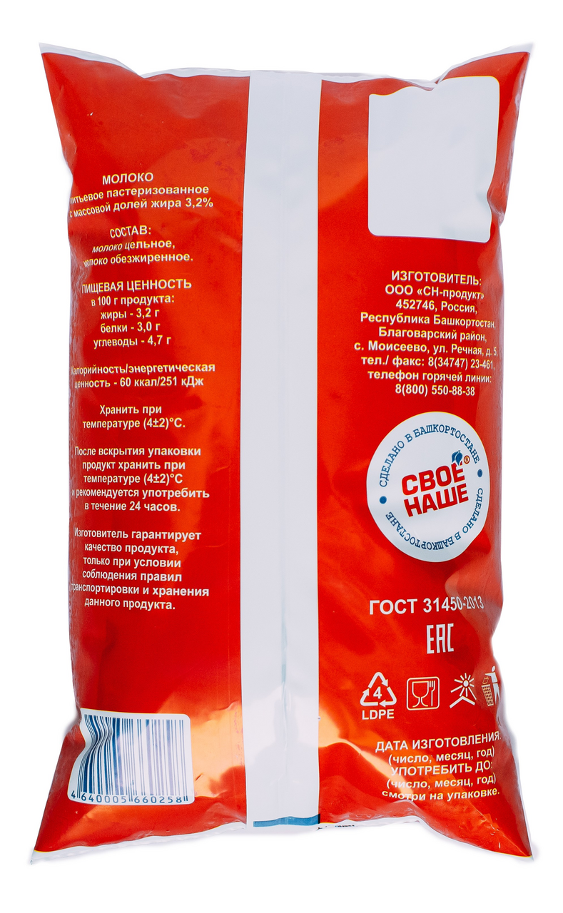 Молоко Свое-Наше 3.2%, 900мл