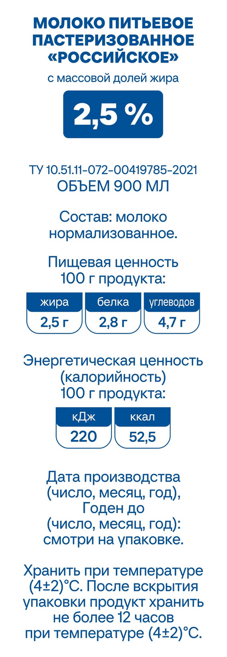 Молоко Молком Российское пастеризованное 2.5%, 900мл