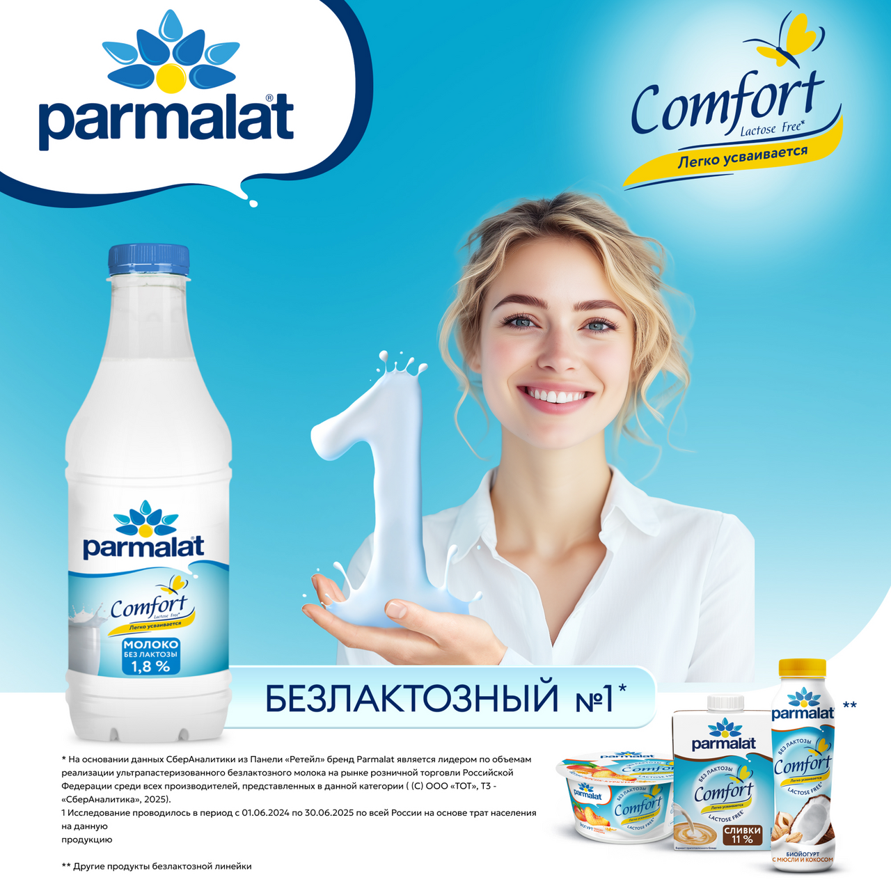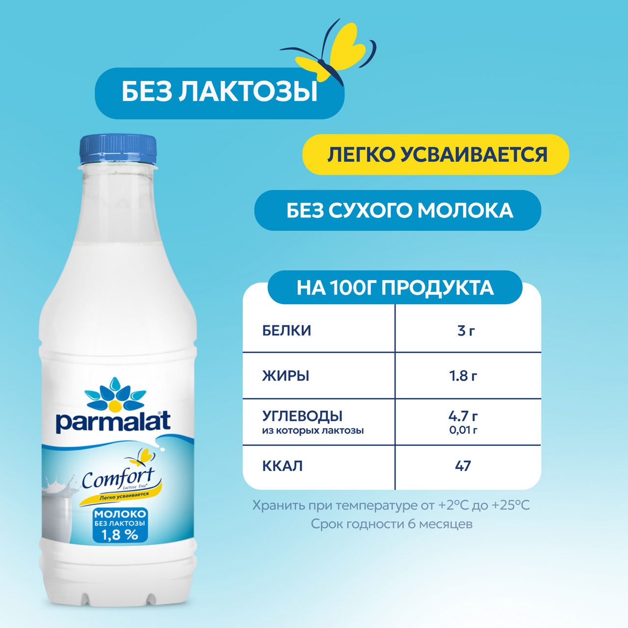 Для многих Parmalat Comfort — первый бренд, который открыл им мир легких, полезных и вкусных безлактозных продуктов. Безлактозный №1* без преувеличения. Молоко питьевое Parmalat Comfort 1,8% не содержит лактозу — молочный сахар, который может плохо усваиваться. Отличный баланс вкуса и калорий, подходит тем, кто следит за своим здоровьем, но не готов отказываться от привычного вкуса молока. Безлактозное молоко содержит все полезные компоненты обычного молока и подходит как для кулинарии, так и в качестве основы для молочных напитков. Наслаждайтесь вкусом молока без ограничений! *На основании данных Нильсен RMS сегмента Безлактозное молоко категории Молоко стерилизованное (которая включает в себя данные о продажах молока стерилизованного у ультрапастеризованного) за 12 месяцев, завершившихся 30.11.2024 г., для общего рынка розничной торговли в Российской Федерации, действительно по состоянию на 13.12.2024 г. (ООО ЭЙ СИ НИЛЬСЕН, 2024г).