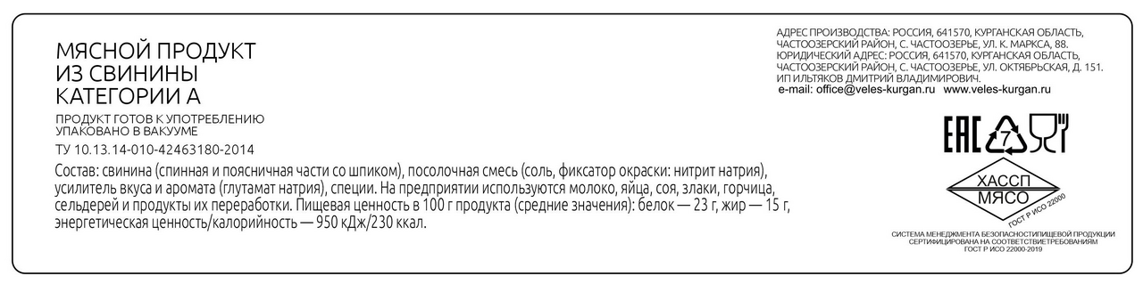 Свинина спинная и поясничная части со шпиком, посолочная смесь соль, фиксатор окраски: нитрит натрия, усилитель вкуса и аромата глутамат натрия, специи.