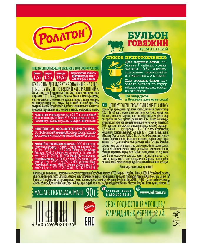 Сухой говяжий бульон быстрого приготовления, обладает отличным вкусом и ароматом. Для получения бульона достаточно залить чайную ложку бульона 400мл кипятка. Каждое блюдо нуждается в финальном штрихе: это может быть веточка зелени или говяжий бульон Роллтон как приправа в супе. А еще можно добавить немного бульона при варке круп, макарон, запекании или тушении мяса, чтобы получить насыщенный вкус.