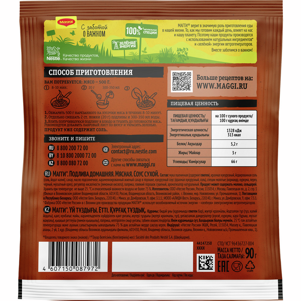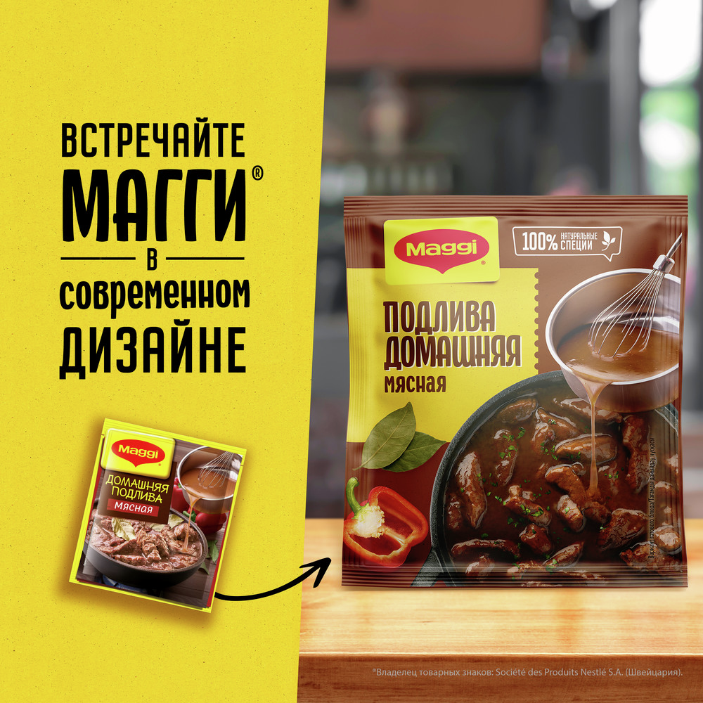 Подлива – это традиционный для российской кухни способ приготовления вторых блюд в отличие от готовых соусов, так готовили ещё наши мамы и бабушки. С Maggi Подливами готовится легко и быстро: не надо обжаривать муку, смешивать все ингредиенты в отдельной кастрюле и заботиться о правильной консистенции. Maggi Подлива домашняя мясная универсальна: готовить с ней можно не только тушеное мясо, но и тефтели, ежики, рагу, макароны и даже грибы.