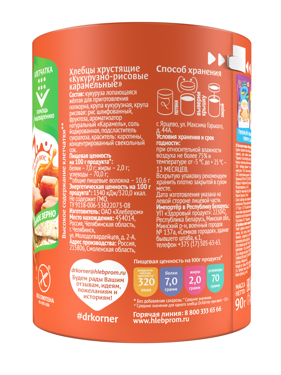 Dr.Korner – современная основа здорового питания! Похожий на любимый с детства вкус карамельного попкорна был создан исключительно благодаря натуральным компонентам в составе и, традиционно для сладких вкусов Dr.Korner, без добавления сахара. Кукурузно-рисовая основа придает хлебцам еще большую нежность и воздушность. Карамельные хлебцы, впервые в линейке Dr.Korner, имеют приятный карамельный оттенок, которого удалось добиться за счет натурального красителя.