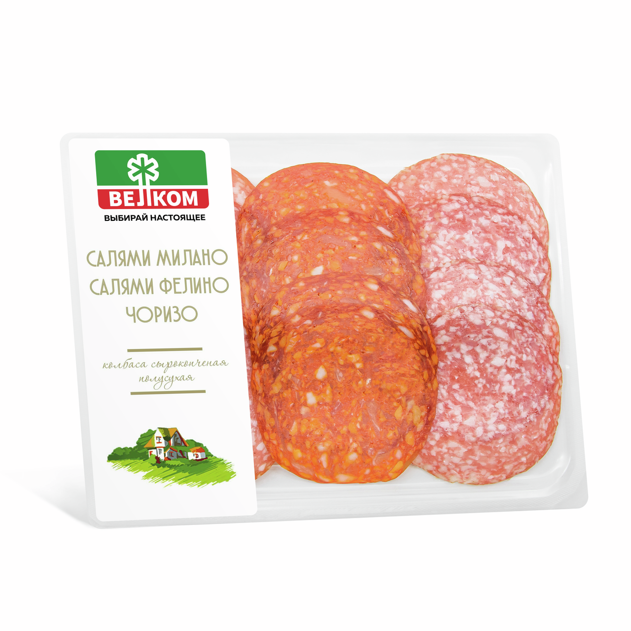 Салями Милано: свинина, шпик, говядина, соль, виноградный сахар, чеснок, орех мускатный, антиокислитель аскорбиновая кислота, ароматизатор (мясной), стартовая культура, фиксатор окраски нитрит натрия; Чоризо: свинина, говядина, соль, паприка, чеснок, орех мускатный, виноградный сахар, антиокислитель аскорбиновая кислота, стартовая культура, фиксатор окраски нитрит натрия; Салями Фелино: свинина, шпик, соль, белок животный, сахар, перец черный, чеснок, орех мускатный, антиокислитель аскорбиновая кислота, стартовая культура, фиксатор окраски нитрит натрия.