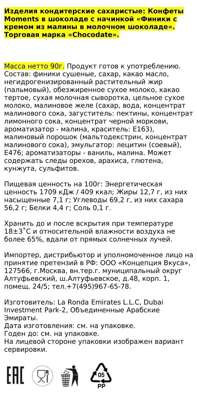 Моменты истинного наслаждения раскрываются в каждой конфете Moments. Изысканное сочетание сочных фиников, нежного малинового крема и благородного шоколада создает неповторимую симфонию вкуса, которая превращает каждый момент в особенное событие. Подарите себе моменты истинного удовольствия с финиками Moments. Откройте для себя новый уровень гастрономического наслаждения. Moments - это не просто десерт, это искусство создавать незабываемые моменты радости и удовольствия. Побалуйте себя и близких этим восхитительным сочетанием природы и мастерства. Каждый момент с Moments - особенный.