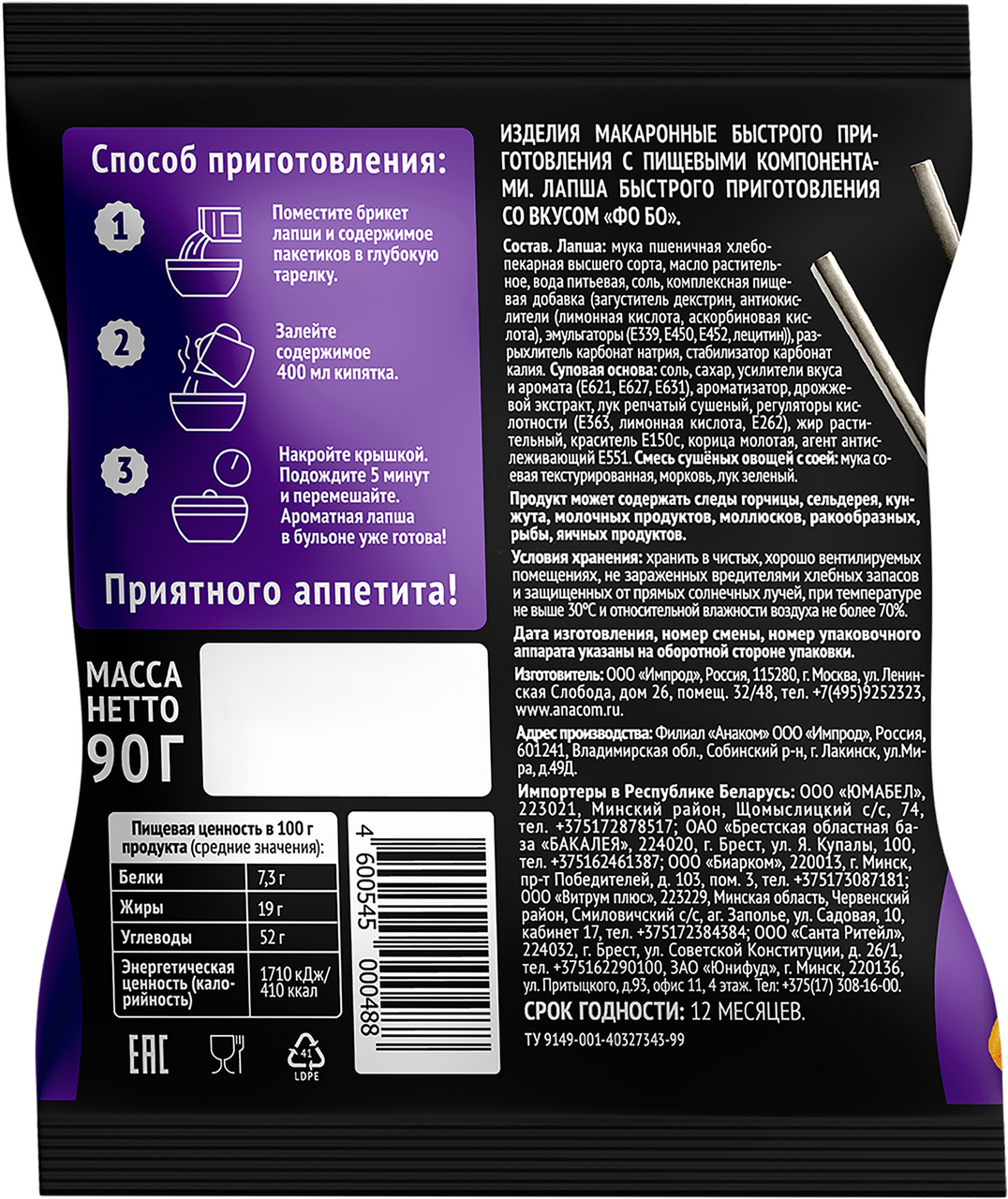 Лапша быстрого приготовления Анаком Фо Бо, 90г