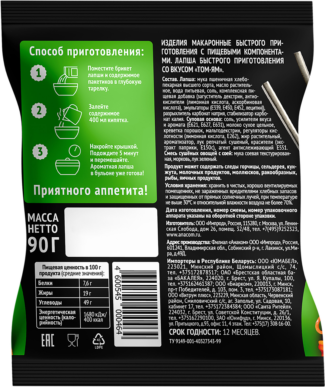 Лапша: мука пшеничная хлебопекарная высшего сорта, масло растительное, вода питьевая, соль, комплексная пищевая добавка (загуститель декстрин, антиокислители (лимонная кислота, аскорбиновая кислота), эмульгаторы (E339, E450, E452, лецитин)), разрыхлитель карбонат натрия, стабилизатор карбонат калия. Суповая основа: соль, усилители вкуса и аромата (E621, E627, E631), молоко сухое цельное, креветка порошок, мальтодекстрин, регуляторы кислотности (лимонная кислота, E262), жир растительный, ароматизатор, лук репчатый сушеный, красители (экстракт паприки, E150с), агент антислеживающий E551. Смесь сушёных овощей с соей: мука соевая текстурированная, морковь, лук зеленый.