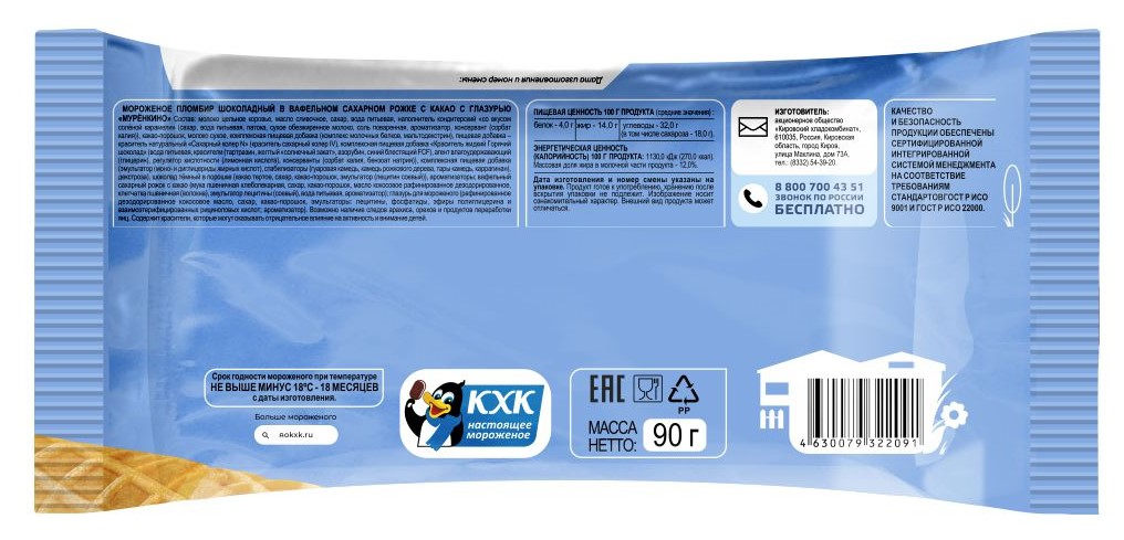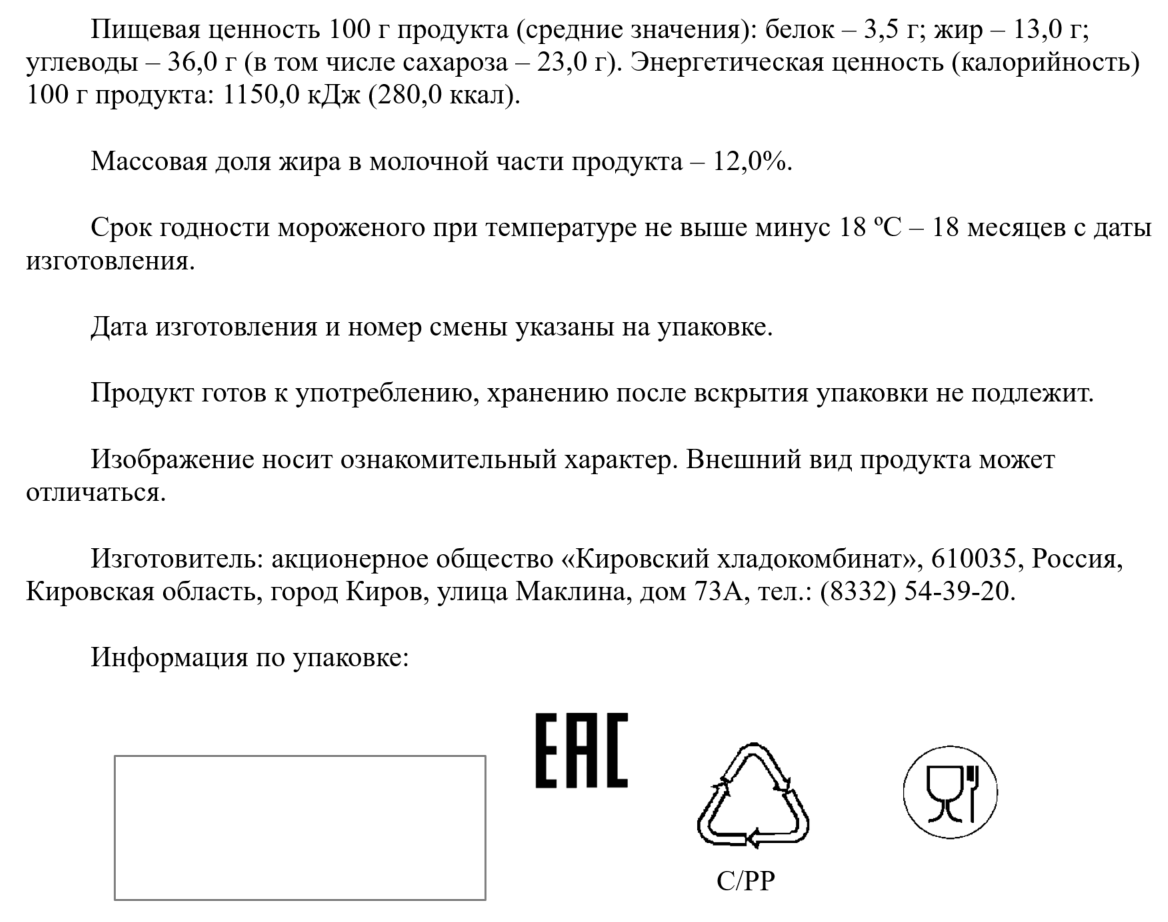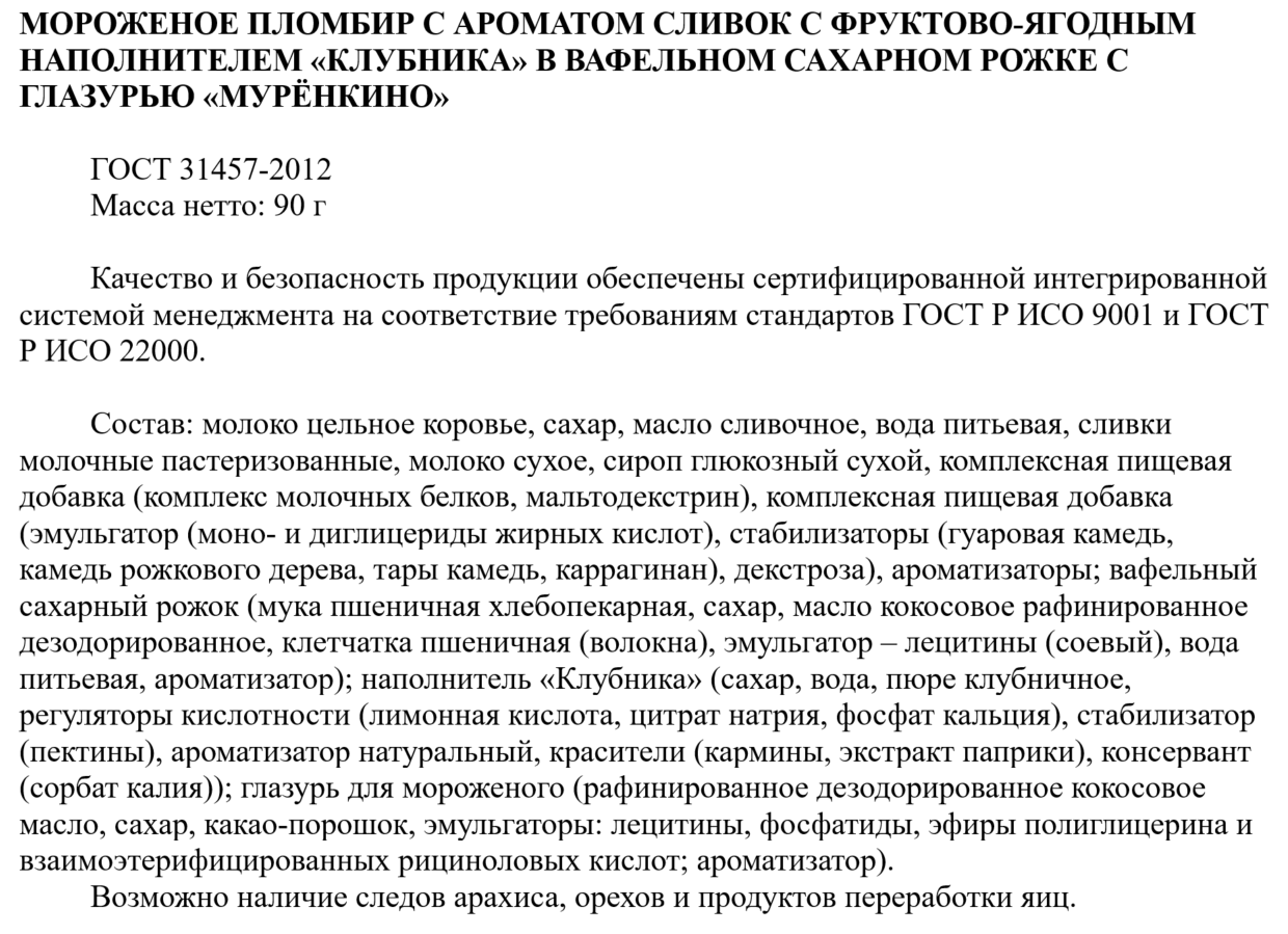 Молоко цельное коровье, сахар, масло сливочное, вода питьевая, сливки молочные пастеризованные, молоко сухое, сироп глюкозный сухой, комплексная пищевая добавка комплекс молочных белков, мальтодекстрин, комплексная пищевая добавка эмульгатор моно - и диглицериды жирных кислот, стабилизаторы гуаровая камедь, камедь рожкового дерева, тары камедь, каррагинан, декстроза, ароматизаторы; вафельный сахарный рожок мука пшеничная хлебопекарная, сахар, масло кокосовое рафинированное дезодорированное, клетчатка пшеничная волокна, эмульгатор – лецитины соевый, вода питьевая, ароматизатор; наполнитель Клубника сахар, вода, пюре клубничное, регуляторы кислотности лимонная кислота, цитрат натрия, фосфат кальция, стабилизатор пектины, ароматизатор натуральный, красители кармины, экстракт паприки, консервант сорбат калия; глазурь для мороженого рафинированное дезодорированное кокосовое масло, сахар, какао-порошок, эмульгаторы: лецитины, фосфатиды, эфиры полиглицерина и взаимоэтерифицированных рициноловых кислот; ароматизатор.