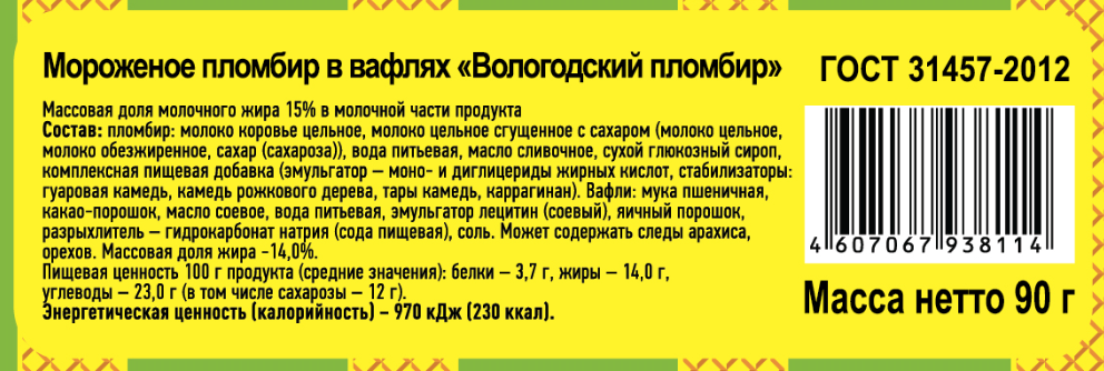 Мороженое пломбир Вологодский пломбир на вафлях, 90г