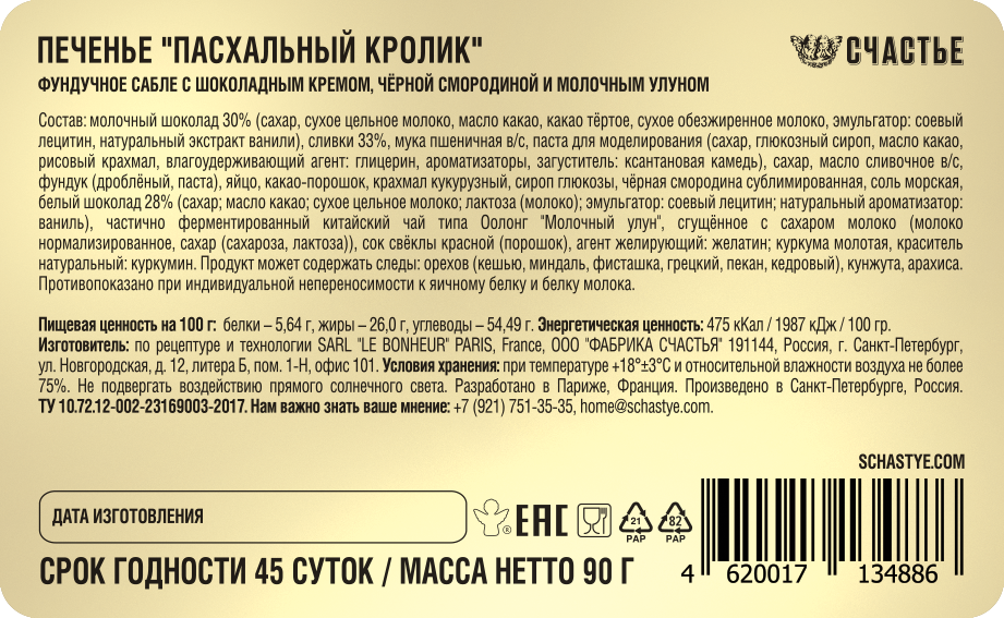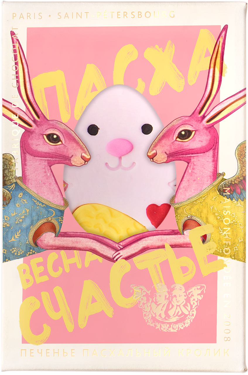 Печенье Счастье Пасхальный кролик фундучное сабле с шоколадным кремом, черной смородиной и молочным улуном, 90г