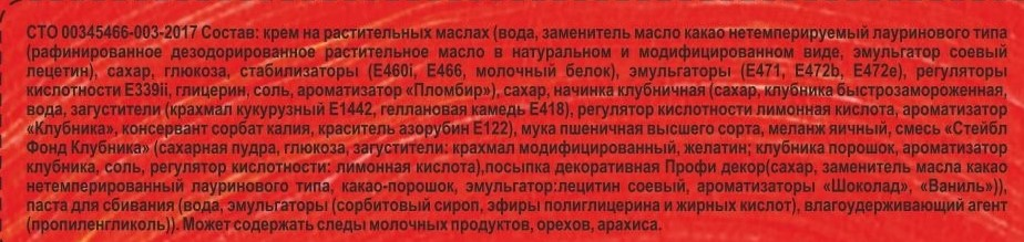 Крем на растительных маслах вода, заменитель масло какао не темперируемый лауринового типа рафинированное дезодорированное растительное масло в натуральном и модифицированном виде, эмульгатор соевый лецитин, сахар, глюкоза, стабилизаторы Е460i, Е466, молочный белок, эмульгаторы Е471, Е472b, Е472е, регуляторы кислотности Е339ii, глицерин, соль, ароматизатор Пломбир, сахар, начинка клубничная сахар, клубника быстрозамороженная, вода, загустители крахмал кукурузный Е1442, геллановая камедь Е418, регулятор кислотности лимонная кислота, ароматизатор Клубника, консервант сорбат калия, краситель азорубин Е122, мука пшеничная высшего сорта, меланж яичный, смесь Стейбл Фонд Клубника сахарная пудра, глюкоза, крахмал модифицированный, желатин, клубника порошок, ароматизатор клубника, соль, регулятор кислотности: лимонная кислота, посыпка декоративная Профи декор сахар, заменитель масла какао не темперированный лауринового типа, какао-порошок, эмульгатор: лецитин соевый, ароматизаторы Шоколад, Ваниль.