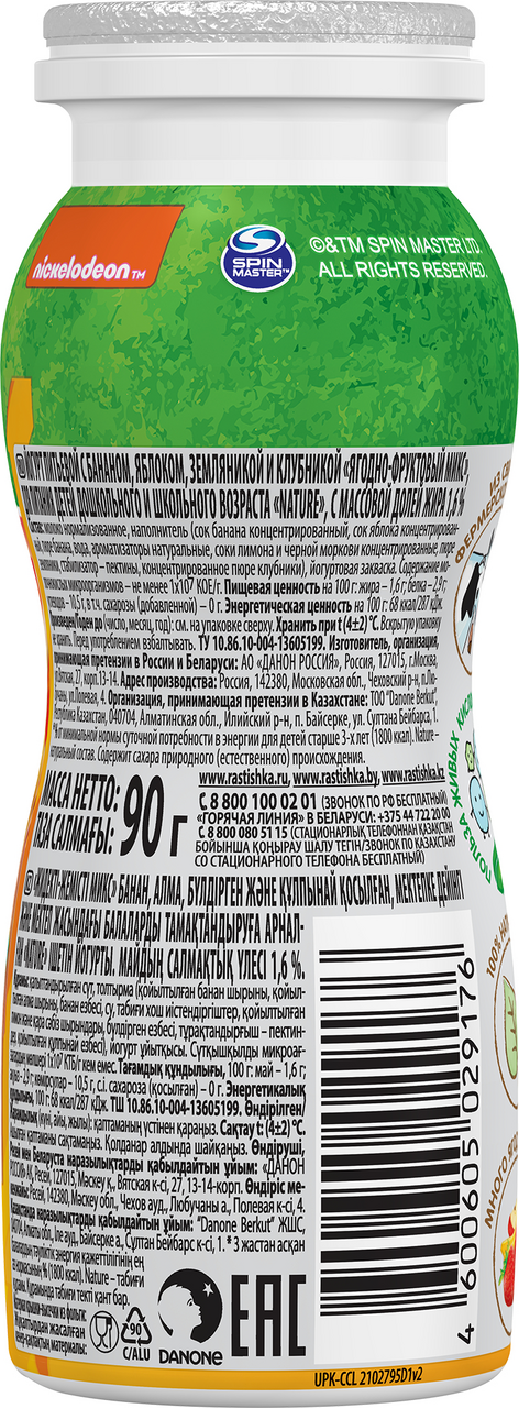 Йогурт питьевой детский Растишка Ягоды и фрукты 1.6% с 3 лет, 90г