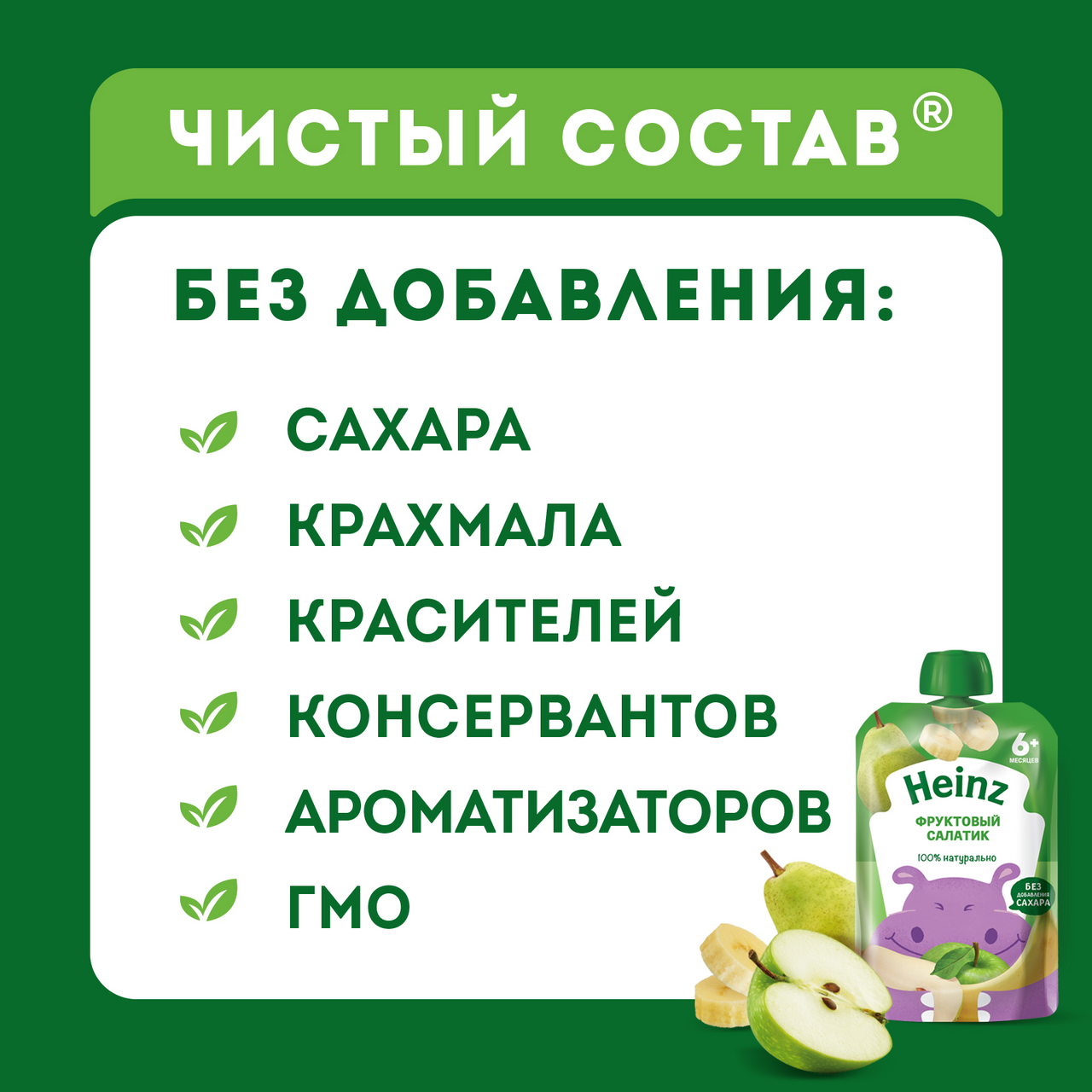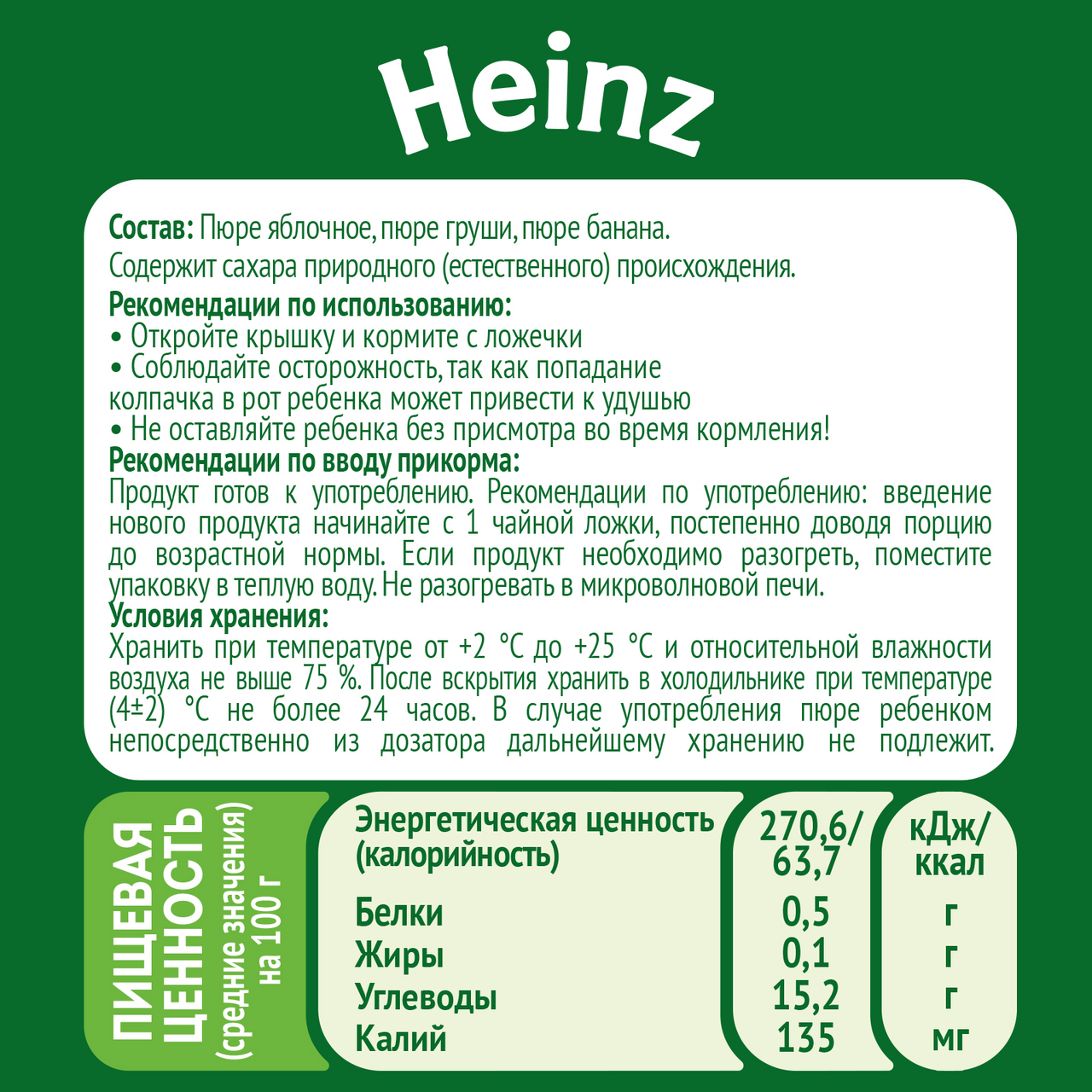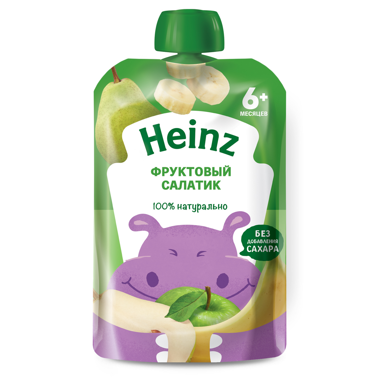 Детское фруктовое пюре Heinz в упаковке с крышечкой создана для кормления детей старше 6 месяцев. Пюре из фруктов можно давать ребенку в качестве полдника или полезного перекуса. Пауч удобно брать с собой, такое пюре малыш сможет есть без помощи взрослых. Продукция не содержит искусственных добавок и произведена только из натуральных ингредиентов. В составе фруктовых салатов Heinz — пюре из яблок, груш и бананов. Фрукты разнообразят рацион малыша, познакомят его с новыми вкусами. Для детского пюре отобраны сочные и спелые фрукты, которые позволят получить природные витамины и минералы. Природная польза фруктов для вашего ребенка. Фруктовые ассорти от Heinz созданы с заботой о самых маленьких.