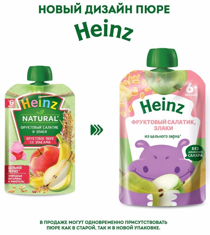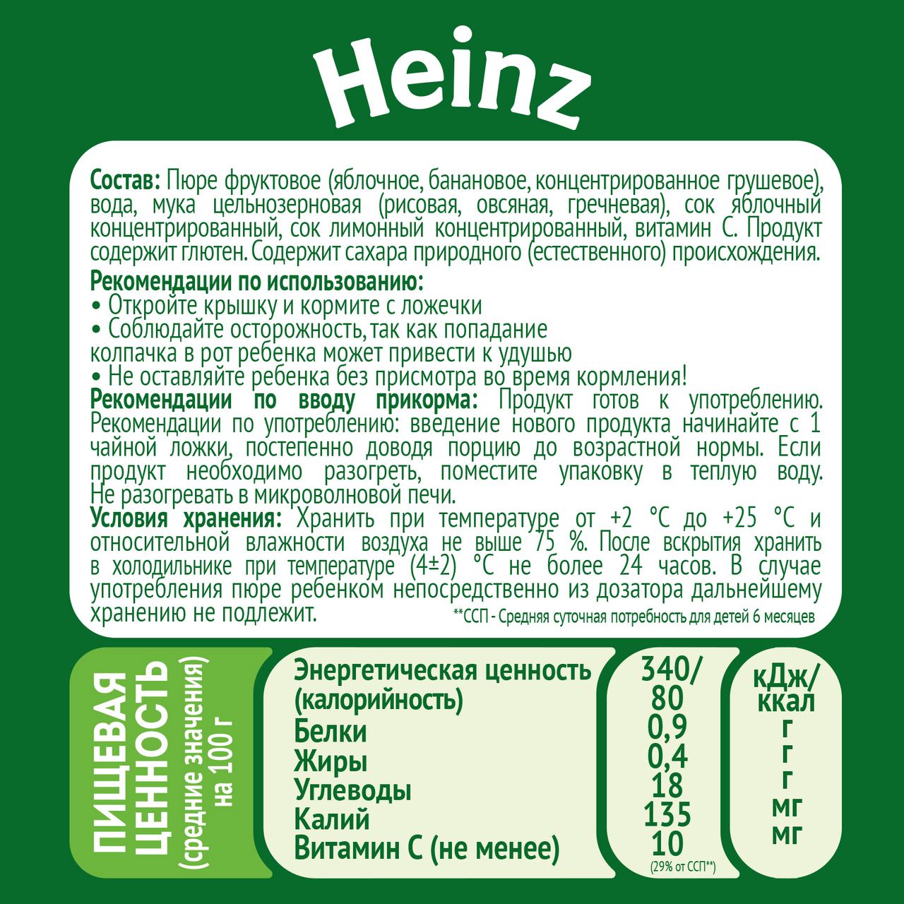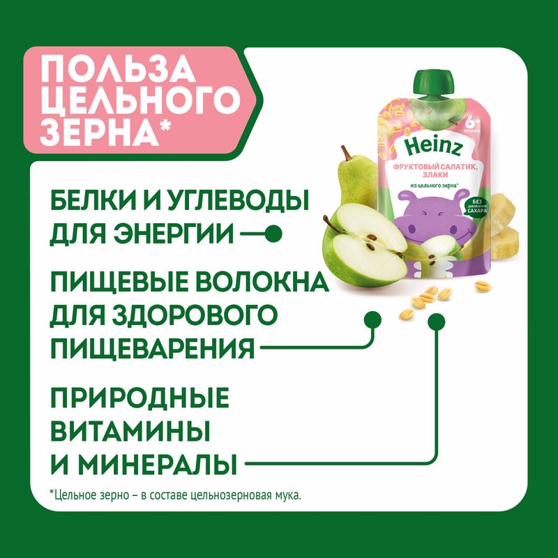 Готовые фруктовые пюре Heinz со злаками — оптимальный вариант для полезного и питательного полдника или перекуса малышей с 6 месяцев. Благодаря упаковке с крышечкой детское пюре легко брать с собой на прогулку. Мягкую упаковку-пауч удобно держать в руках, поэтому ребенок сможет есть пюре самостоятельно. Фруктово-злаковые пюре Heinz из банана, яблока и груши, а также цельнозерновой муки — отличный источник энергии и незаменимых нутриентов. При производстве детских пюре со злаками используются все части зерна, включая отруби и зародыш, что сохраняет пользу цельных злаков. Фруктовые салаты Heinz со злаками созданы с заботой о здоровье самых маленьких.