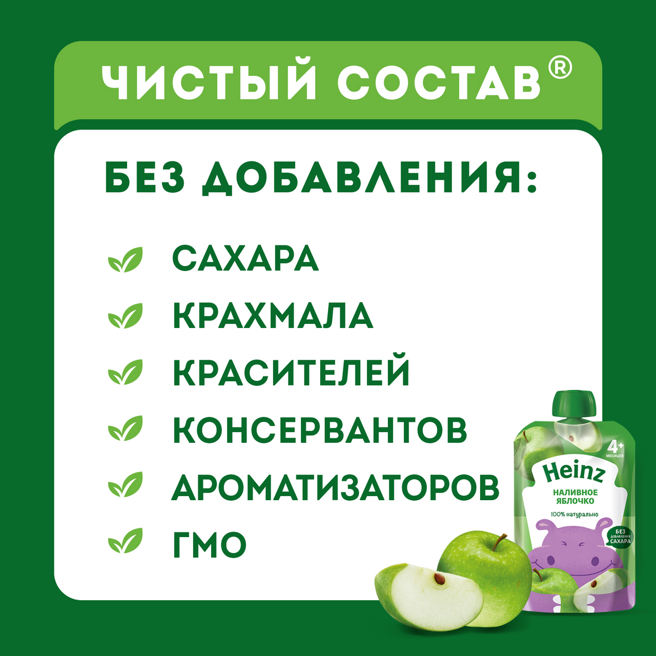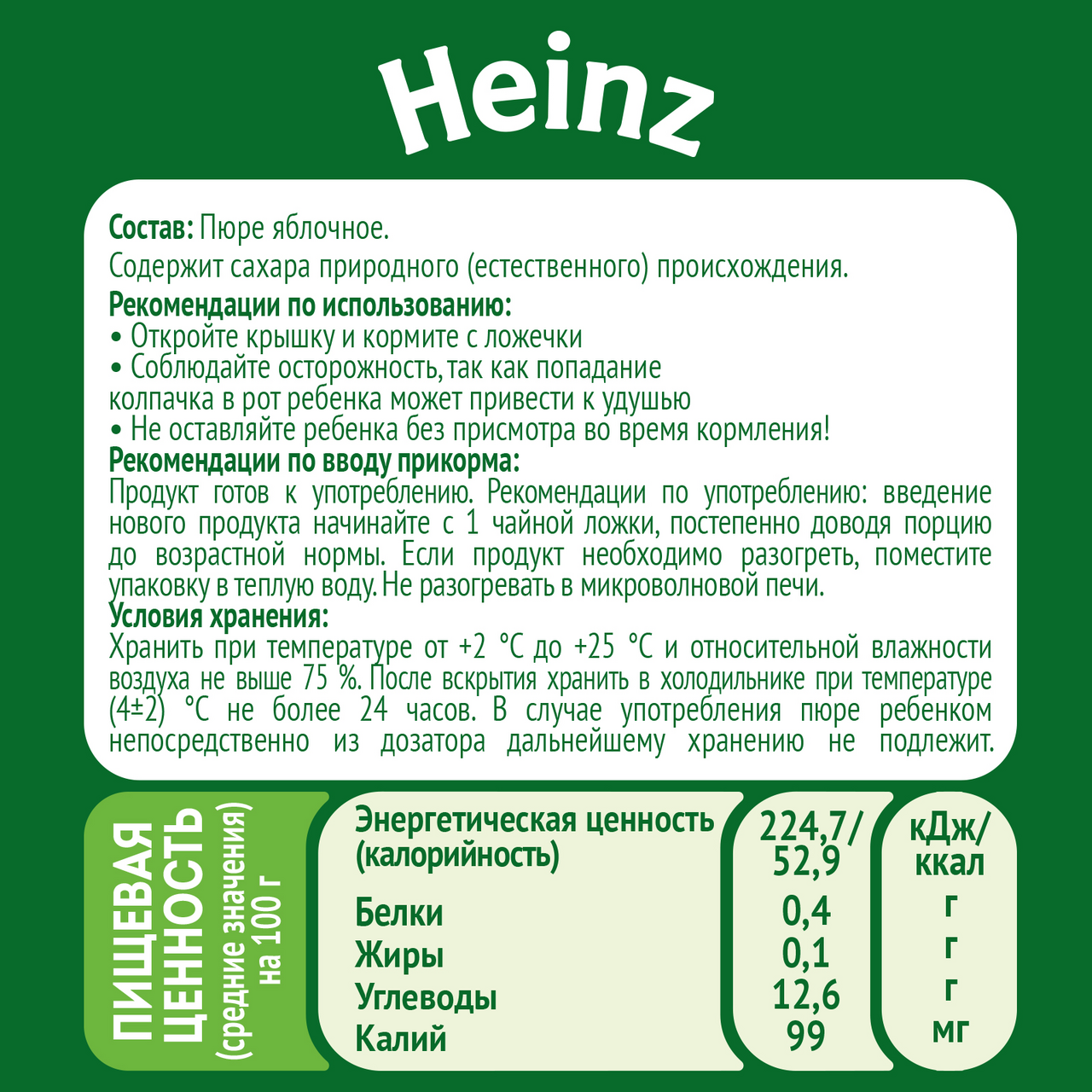 Готовое яблочное пюре Heinz в герметичной упаковке с крышечкой подходит для кормления малышей с 4 месяцев. Продукт можно давать ребенку в качестве полдника или полезного перекуса. Благодаря удобному формату упаковки пюре удобно брать с собой, например, на прогулку или в дорогу, а ребенок сможет есть пюре самостоятельно. Фруктовые пюре произведены только из натуральных ингредиентов и не содержат искусственных добавок. Яблоки — источник калия, магния, витаминов группы B, аскорбиновой кислотой и богаты пектином и растительной клетчаткой, поддерживающими работу кишечника. Для пюре отобраны сочные и спелые фрукты, которые позволят получить необходимые витамины и минералы. Природная польза фруктов для вашего ребенка. Детские яблочные пюре Heinz создаются с заботой о самых маленьких.