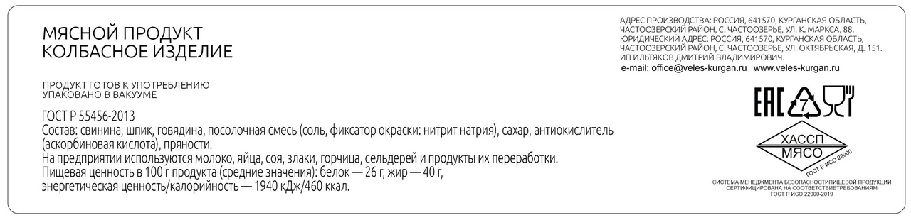 Свинина, шпик, говядина, посолочная смесь соль, фиксатор окраски: нитрит натрия, сахар, антиокислитель аскорбиновая кислота, пряности.