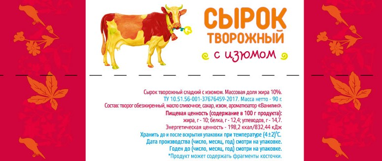 Творог обезжиренный, масло сливочное, сахар, изюм, ароматизатор "Ванилин".