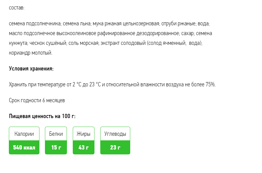 Семена подсолнечника, семена льна, мука ржаная цельнозерновая, отруби ржаные, вода, масло подсолнечное высокоолеиновое рафинированное дезодорированное, сахар, семена кунжута, чеснок сушеный, соль морская, экстракт солодовый, кориандр молотый.