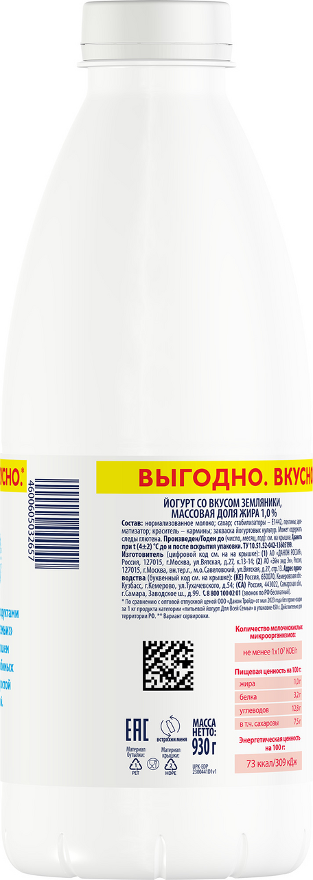 Продукт йогуртный Для всей семьи земляника 1%, 930 г – нежнейший кисломолочный продукт, который станет прекрасным дополнением семейного завтрака или полноценным перекусом вне дома. Йогурт обладает густой текстурой, вкусным сливочным ароматом и вкусом. Йогурт можно употреблять как самостоятельное блюдо. Кроме того, им можно заправить фруктовый салат, мюсли. Он прекрасно сочетается с сырниками, оладушками, блинчиками, панкейками, свежими французскими тостами, гренками. Кисломолочный продукт избавляет от тяжести в животе и ускоряет метаболизм. Продукт помогает справиться с чувством голода и зарядиться энергией.