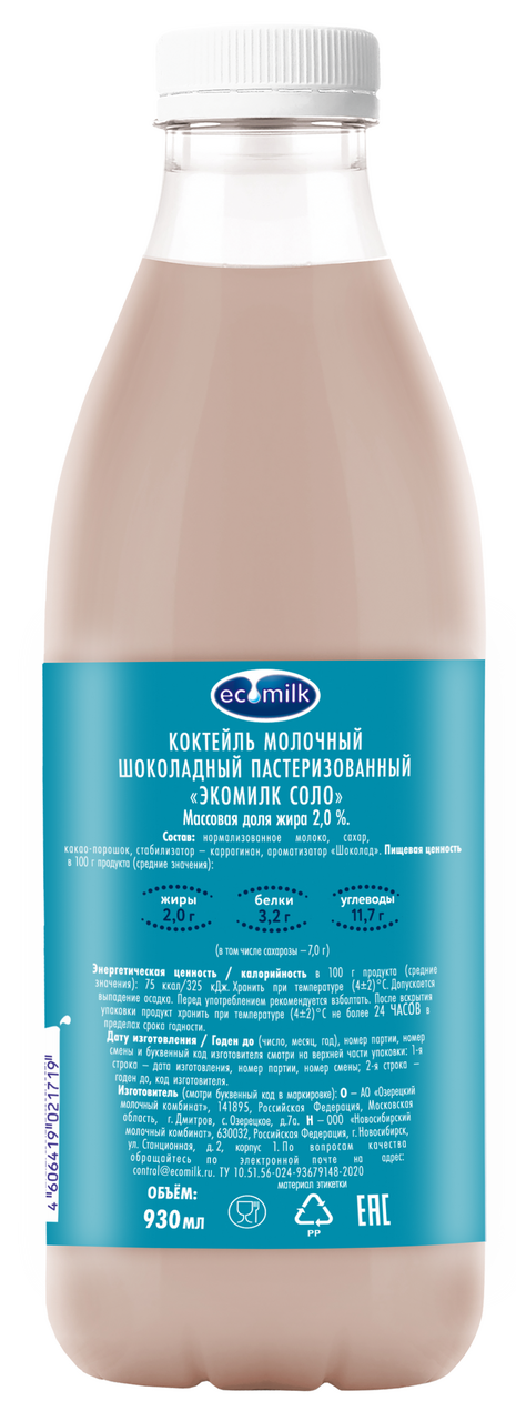 Коктейль молочный Экомилк шоколад 2%, 930мл