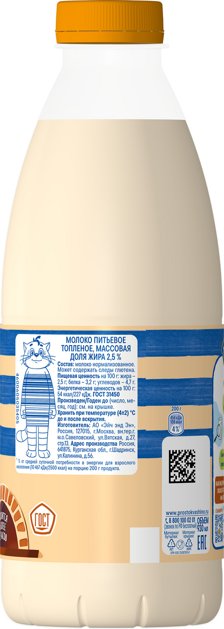 Молоко Топленое Простоквашино 2,5% 930г - традиционный продукт, который производится из молока путем нагревания и топления более 3 часов. Топлёное молоко отлично дополнит ваш завтрак, его можно добавить в кофе или чай или выпить на ночь. Кроме того, оно отлично подойдет для готовки блинчиков, каш и множества других любимых домашних блюд.