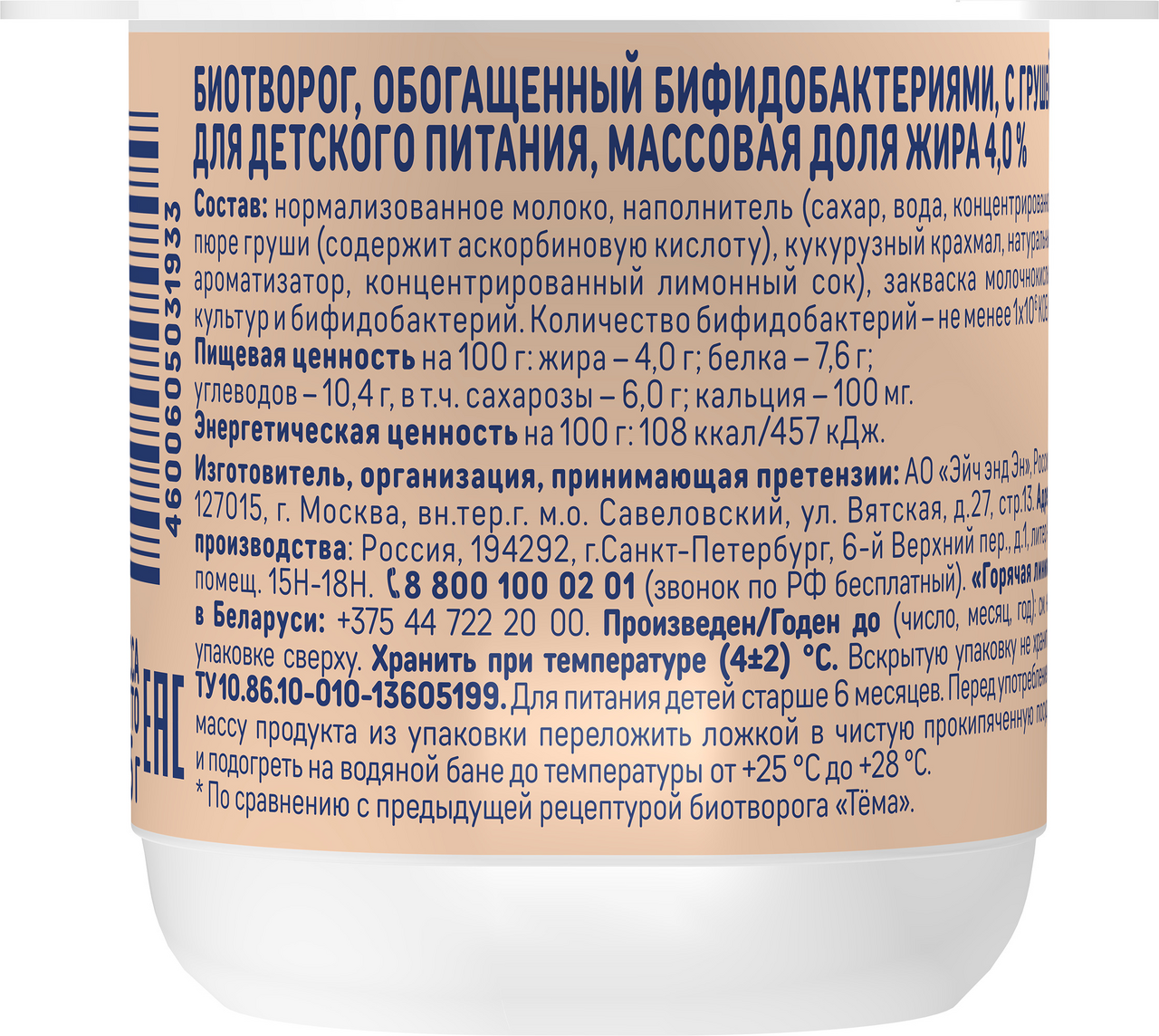 Биотворог детский Тема Груша 4% с 6 месяцев, 95г