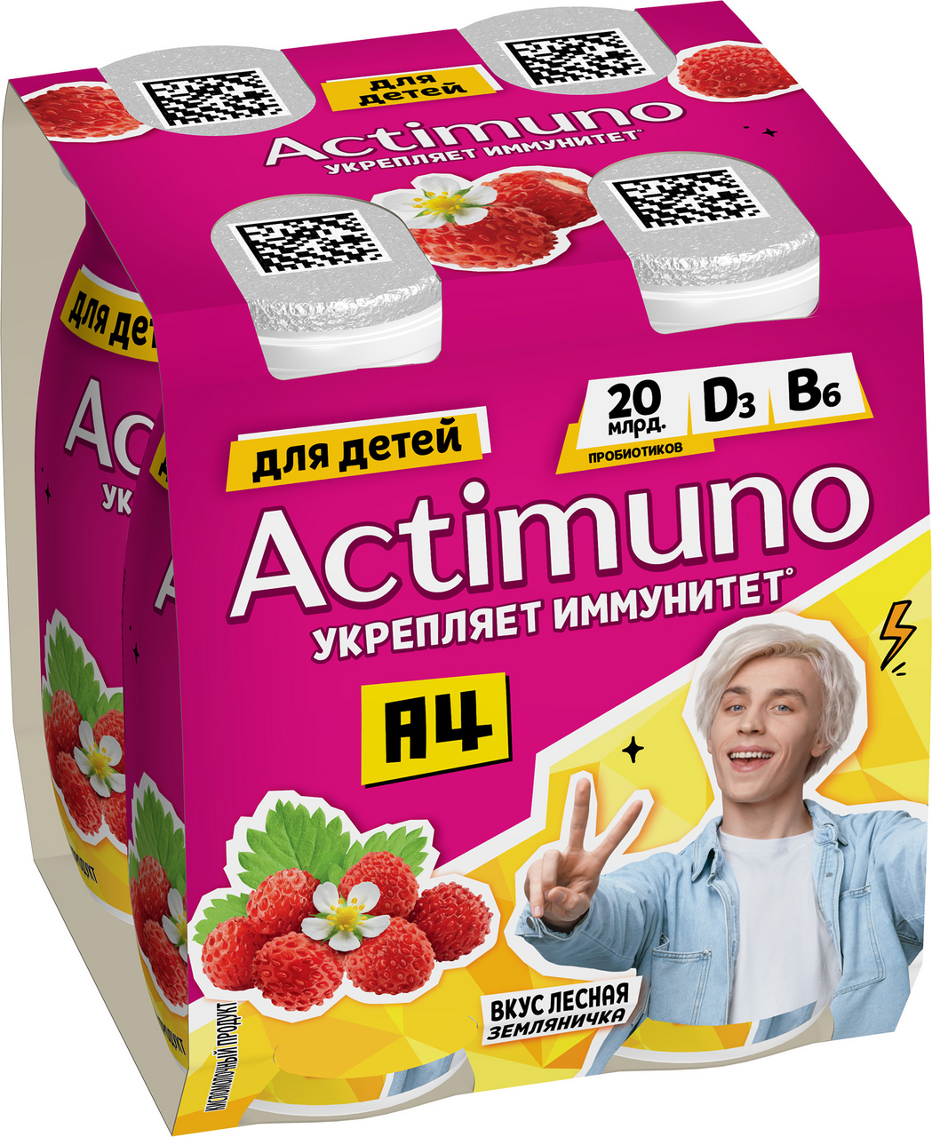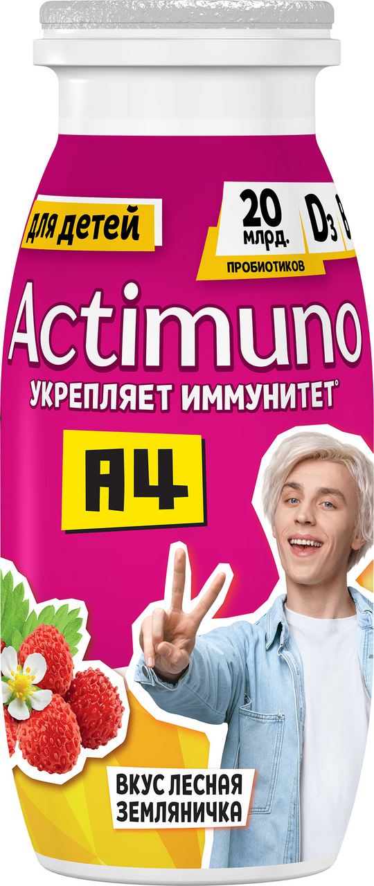 Напиток кисломолочный детский Actimuno Kids Лесная земляника 1.5% с 3 лет, 95г