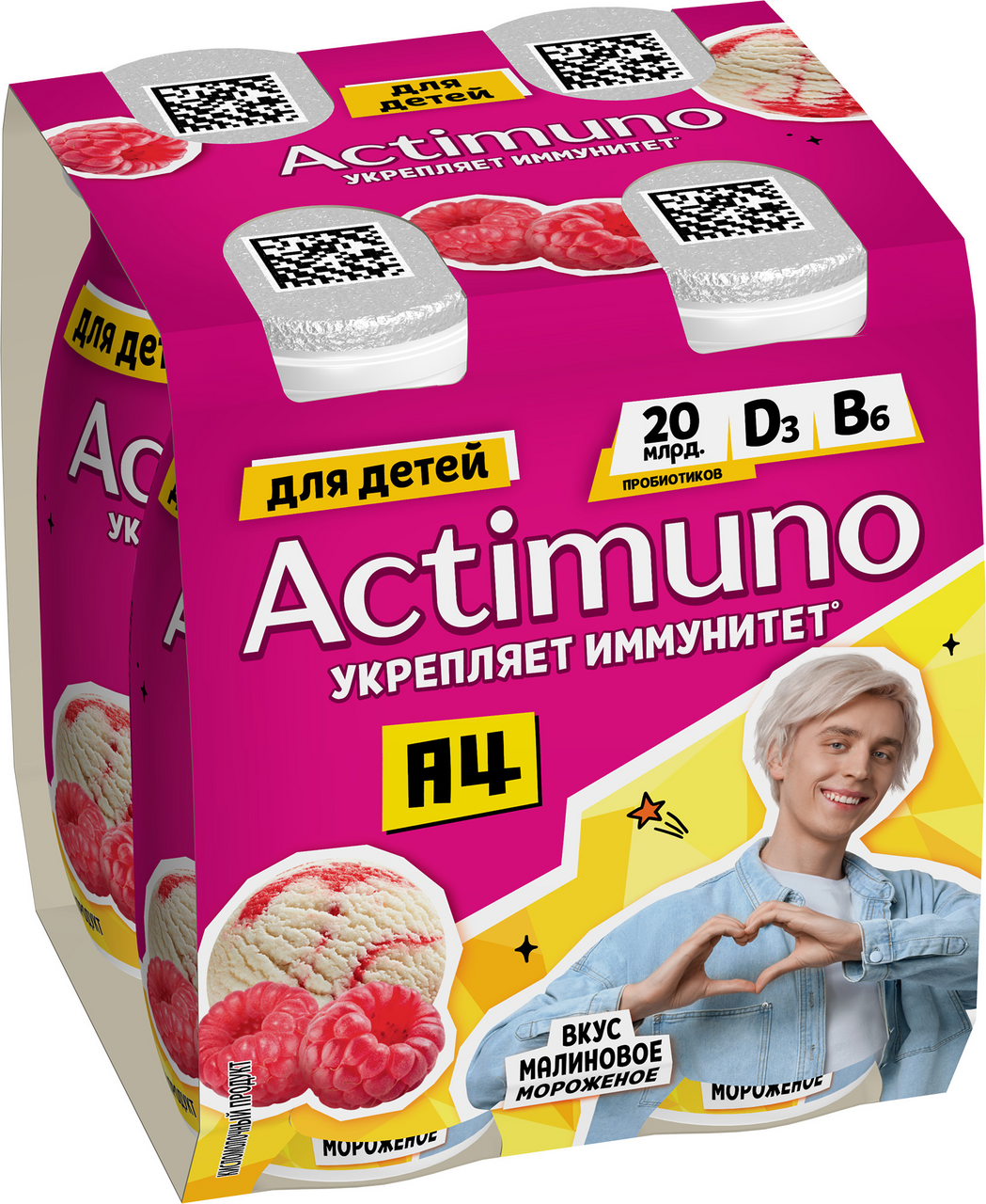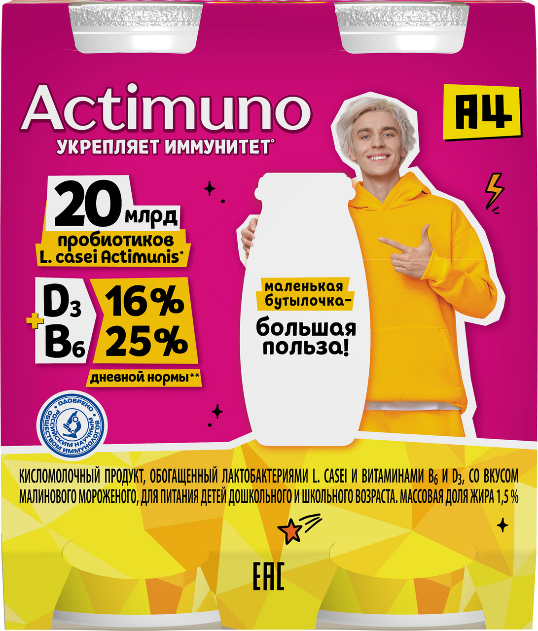 Это один из самых доступных способов ежедневного укрепления иммунитета, ведь в такой маленькой бутылочке содержатся 20 миллиардов пробиотиков L.Casei Imunitass и витамины B6, D3. Укрепить иммунитет ребёнка можно с Actimuno со вкусом малиновое мороженое.